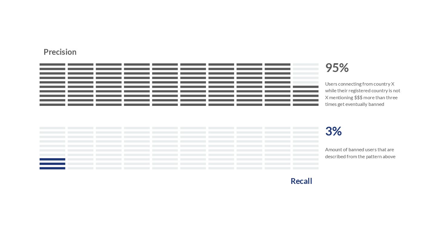 is not X mentioning $$$ more than three times get eventually banned 3% Amount of banned users that are described from the pattern above Precision Recall