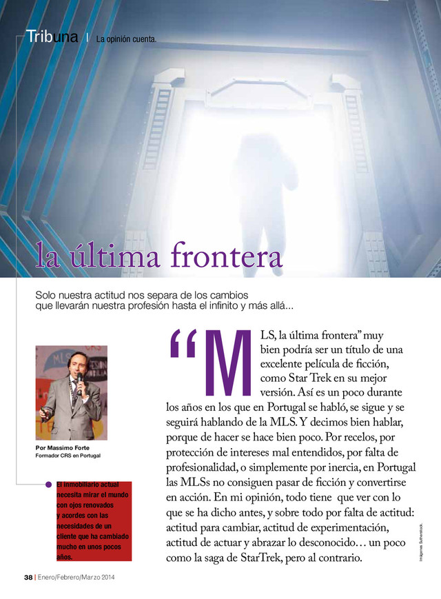 cualquier red inmobiliaria, ya sea franquiciada o propia. Sabemos que la capacidad de colaborar o de relacionar- nos con otros es una pieza fundamen- tal en cualquier negocio; por eso no me parece que tenga mucho sentido que las personas o las empresas que pertenezcan a una red no saquen partido de eso y si- gan de espaldas a la cooperación. Muchas franquicias, incluso fuera del sector inmobiliario, incluyen networking como parte de su oferta. Esto es lógico. Cual- quiera que esté en una franquicia lo sabe, y sabe como sacar el mejor provecho de su red de networking, que pasa por utilizar herramientas como las MLSs interiores de sus marcas. En Portugal esto posiblemente pasa por las dimensiones que han adquirido las marcas, por la formación y por los sis- temas informáticos que facilitan, pero mu- chas de ellas facilitan cosas que solo algunos aprovechan, el ADN de la marca que nos lleva a hacer las cosas de una manera similar bastante facilidad información relativa a esto en la web. Lo que sí quiero es trans- mitir es que para mi la MLS es antes que nada una forma de estar en el mercado inmobiliario actual y futuro, y sobre todo una forma proactiva y de éxito. Para finalizar, me gustaría compartir con vosotros un pensamiento y un desafío. Re- cuerdo que de niño me gustaba mucho la serie Espacio 1999, y pensaba que en ese año todo estaría muy avanzado y diferente. A pesar de todo, ese año llegó y muchas otras cosas se han realizado después y otras muchas que había han quedado superadas. Los sistemas de MLS son ya una realidad probada en la evolución de la mediación inmobiliaria, y por eso yo os quiero de- safiar a no dejar que las cosas queden en esperanza de futuro, y a que realicéis vues- tros sueños hoy, comenzando desde ahora mismo a constituir vuestra propia tribu. que los demás miembros y con un método único, citando a Seth Godin, que nos lleva a pertenecer a una “tribu”. En el fondo, la constitución de una MLS no es más que la constitución de una tri- bu, una tribu local –o no estaríamos ha- blando de mercados inmobiliarios loca- les– donde un grupo de personas domina algo –en este caso una ciudad o una zona– con el objetivo de ofrecer a sus habitantes actuales y futuros la mejor información posible… en este caso el mejor servicio inmobiliario posible. Para eso se juntan en grupos de profesionales de mediación inmobiliaria que se identifican por el ser- vicio que prestan, por la forma de trabajar, y principalmente por la visión y la actitud de compartir, formando así tribus locales que revalorizan sus negocios. No pretendo aquí hablar de la mejor for- ma de construir una MLS; para eso ya hay varios libros y manuales, y hasta em- presas, e incluso se puede encontrar con Massimo Forte es un colaborador habitual que escribe desde XXXXX. www.inmobiliarios20.com | 39