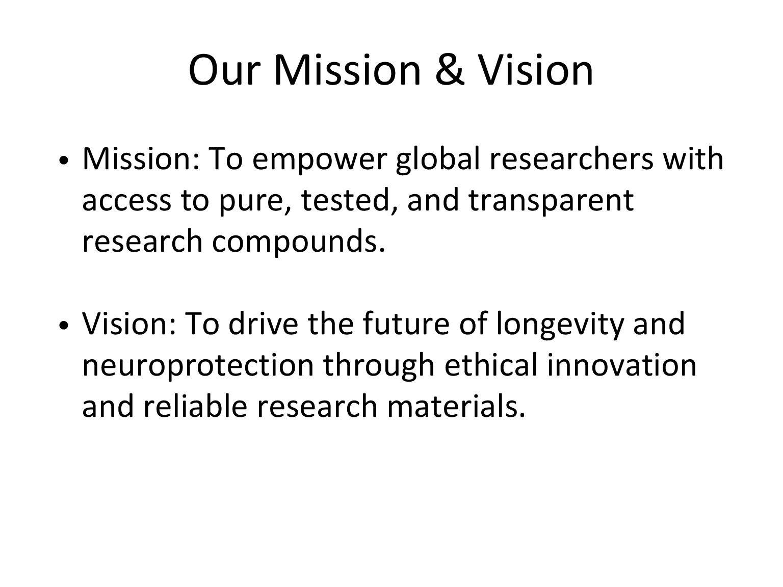access to pure, tested, and transparent research compounds. Vision: To drive the future of longevity and neuroprotection through ethical innovation and reliable research materials.