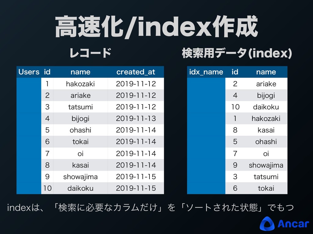 ߴԽJOEFY࡞ Ϩίʔυ ݕࡧ༻σʔλ JOEFY 6TFST JE OBNF DSFBUFE@BU IBLP[BLJ