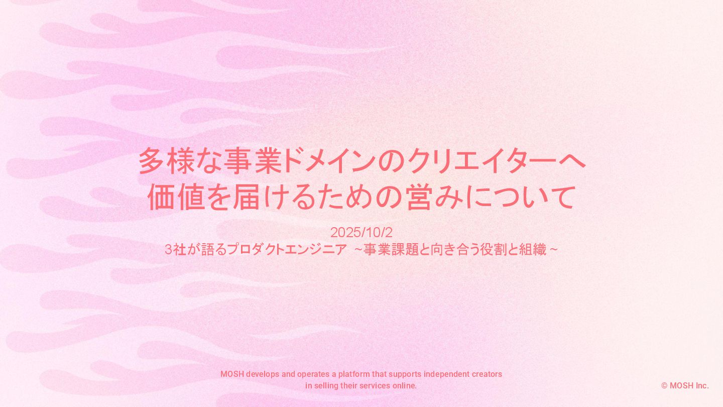 多様な事業ドメインのクリエイターへ 価値を届けるための営みについて 2025/10/2 3社が語るプロダクトエンジニア ~事業課題と向き合う役割と組織 ~ © MOSH Inc. MOSH