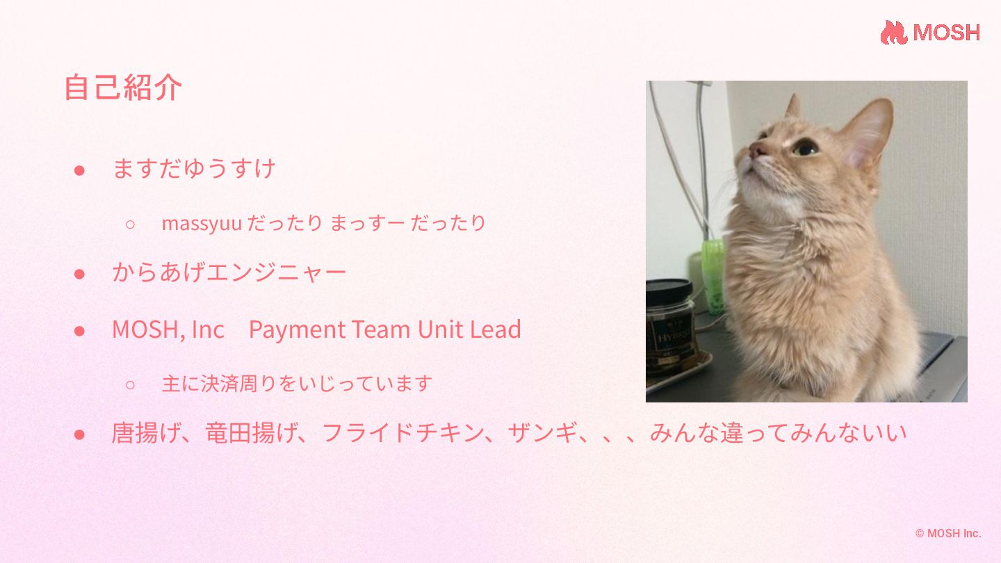 • MOSH, Inc Payment Team Unit Lead ◦ 主に決済周りをいじっています • 唐揚げ、⻯⽥揚げ、フライドチキン、ザンギ、、、みんな違ってみんないい © MOSH Inc.