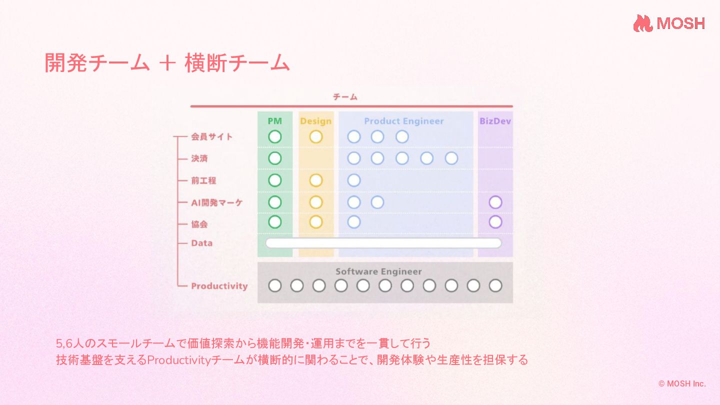 開発チーム + 横断チーム © MOSH Inc. 5,6人のスモールチームで価値探索から機能開発・運用までを一貫して行う 技術基盤を支えるProductivityチームが横断的に関わることで、開発体験や生産性を担保する
