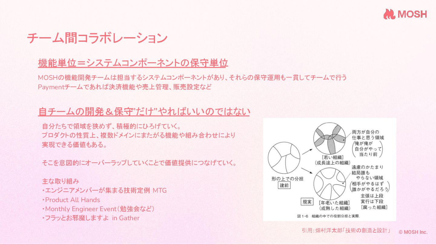 チーム間コラボレーション © MOSH Inc. 機能単位=システムコンポーネントの保守単位 MOSHの機能開発チームは担当するシステムコンポーネントがあり、それらの保守運用も一貫してチームで行う Paymentチームであれば決済機能や売上管理、販売設定など 自チームの開発&保守”だけ”やればいいのではない 自分たちで領域を狭めず、積極的にひろげていく。 プロダクトの性質上、複数ドメインにまたがる機能や組み合わせにより