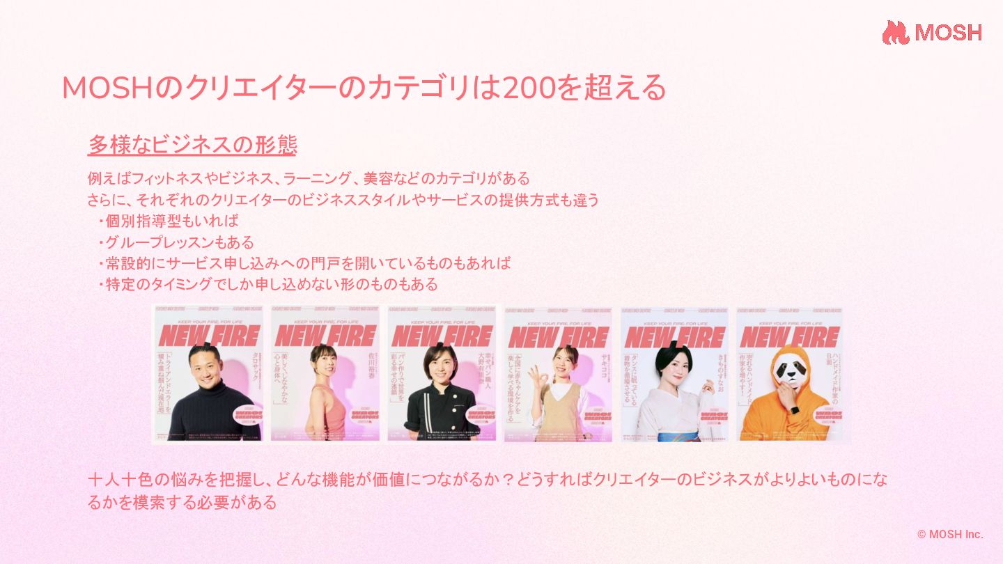 MOSHのクリエイターのカテゴリは200を超える © MOSH Inc. 多様なビジネスの形態 例えばフィットネスやビジネス、ラーニング、美容などのカテゴリがある さらに、それぞれのクリエイターのビジネススタイルやサービスの提供方式も違う ・個別指導型もいれば ・グループレッスンもある ・常設的にサービス申し込みへの門戸を開いているものもあれば