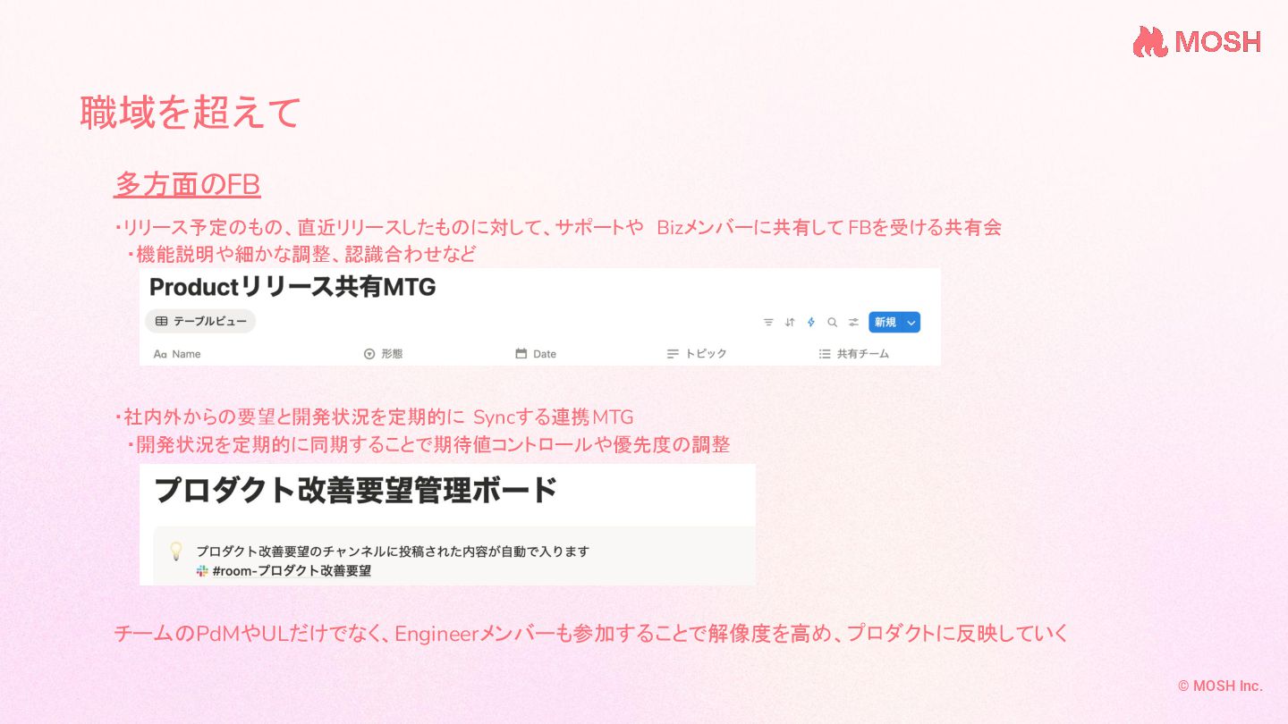 職域を超えて © MOSH Inc. 多方面のFB ・リリース予定のもの、直近リリースしたものに対して、サポートや Bizメンバーに共有して FBを受ける共有会 ・機能説明や細かな調整、認識合わせなど ・社内外からの要望と開発状況を定期的に