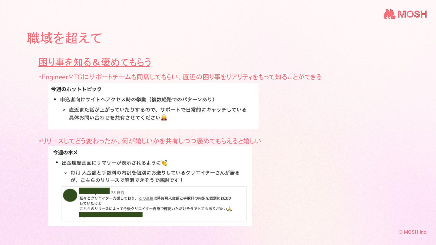 職域を超えて © MOSH Inc. 困り事を知る&褒めてもらう ・EngineerMTGにサポートチームも同席してもらい、直近の困り事をリアリティをもって知ることができる ・リリースしてどう変わったか、何が嬉しいかを共有しつつ褒めてもらえると嬉しい