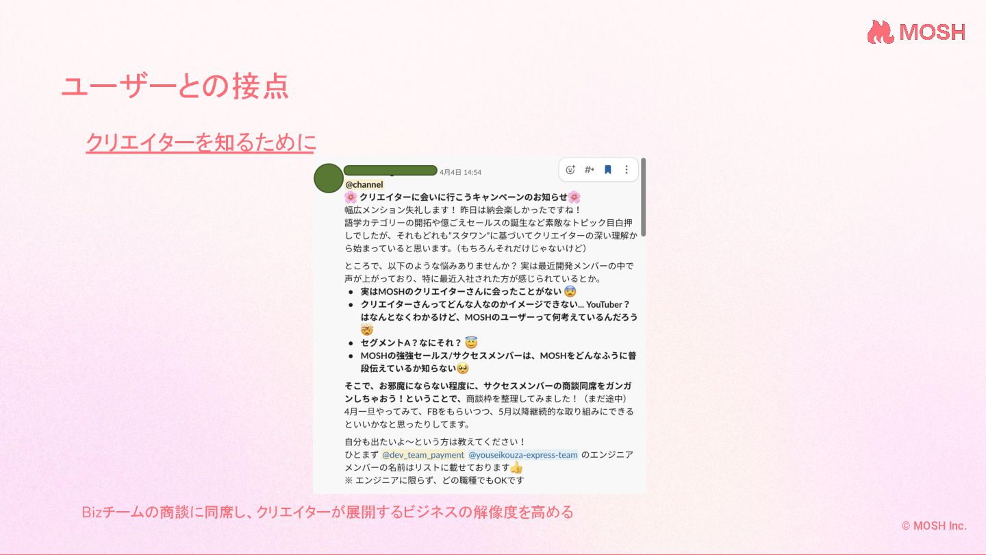 ユーザーとの接点 © MOSH Inc. クリエイターを知るために Bizチームの商談に同席し、クリエイターが展開するビジネスの解像度を高める