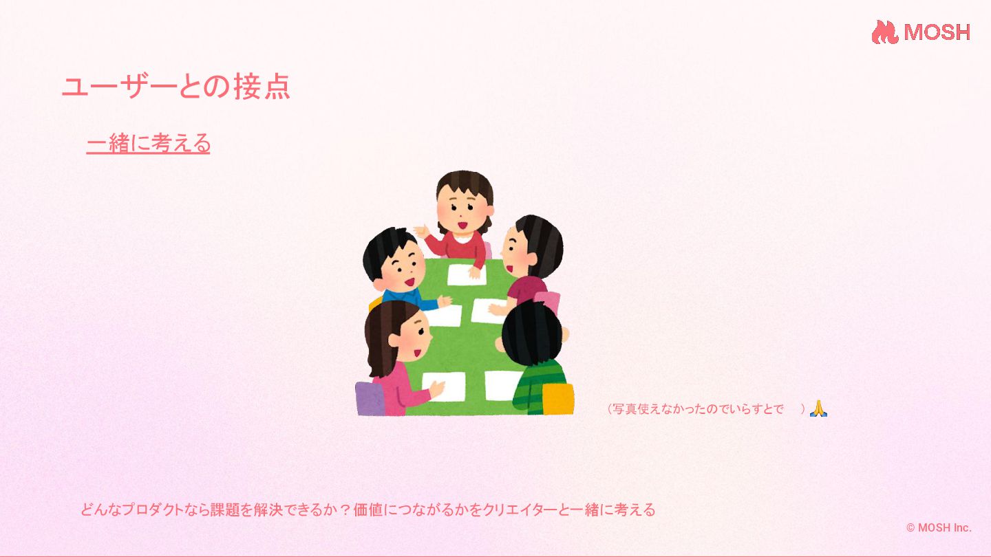ユーザーとの接点 © MOSH Inc. 一緒に考える どんなプロダクトなら課題を解決できるか?価値につながるかをクリエイターと一緒に考える (写真使えなかったのでいらすとで )