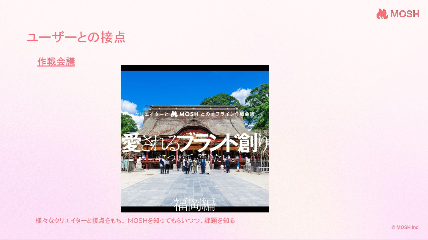 ユーザーとの接点 © MOSH Inc. 作戦会議 様々なクリエイターと接点をもち、 MOSHを知ってもらいつつ、課題を知る