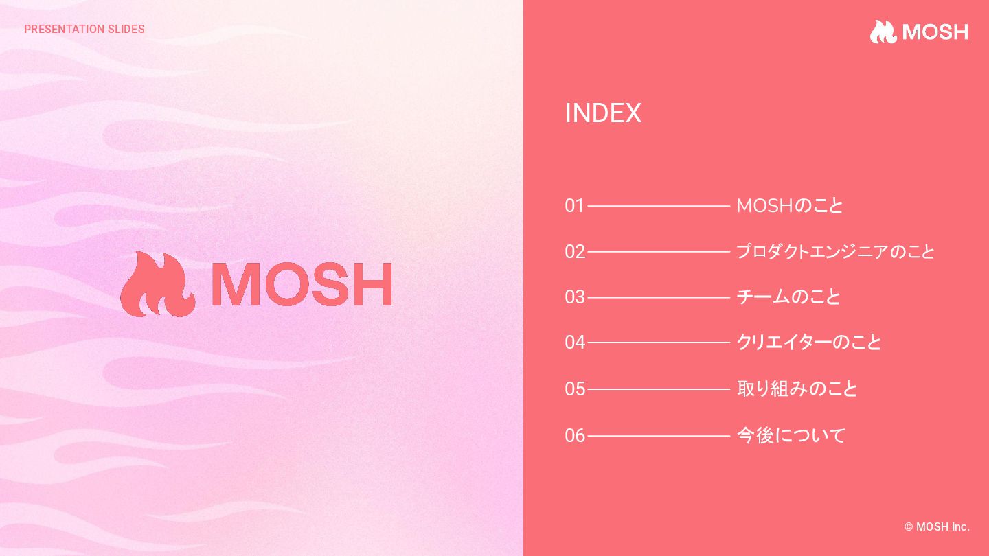 PRESENTATION SLIDES © MOSH Inc. INDEX 01 MOSHのこと 02 プロダクトエンジニアのこと