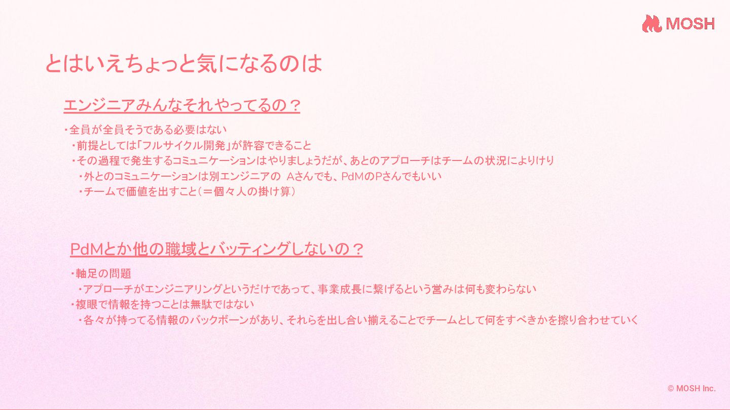 とはいえちょっと気になるのは © MOSH Inc. エンジニアみんなそれやってるの? ・全員が全員そうである必要はない ・前提としては「フルサイクル開発」が許容できること ・その過程で発生するコミュニケーションはやりましょうだが、あとのアプローチはチームの状況によりけり ・外とのコミュニケーションは別エンジニアの Aさんでも、PdMのPさんでもいい