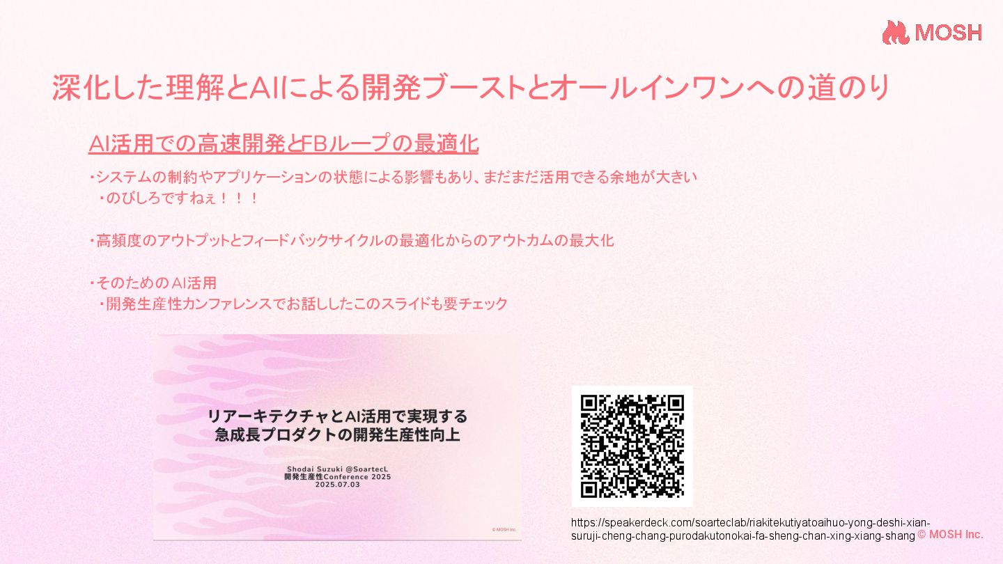 深化した理解とAIによる開発ブーストとオールインワンへの道のり © MOSH Inc. AI活用での高速開発とFBループの最適化 ・システムの制約やアプリケーションの状態による影響もあり、まだまだ活用できる余地が大きい ・のびしろですねぇ!!! ・高頻度のアウトプットとフィードバックサイクルの最適化からのアウトカムの最大化 ・そのためのAI活用 ・開発生産性カンファレンスでお話ししたこのスライドも要チェック