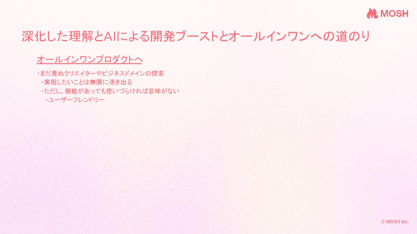 © MOSH Inc. オールインワンプロダクトへ ・まだ見ぬクリエイターやビジネスドメインの探索 ・実現したいことは無限に湧き出る ・ただし、機能があっても使いづらければ意味がない ・ユーザーフレンドリー 深化した理解とAIによる開発ブーストとオールインワンへの道のり