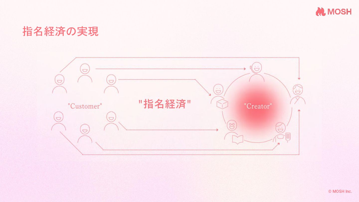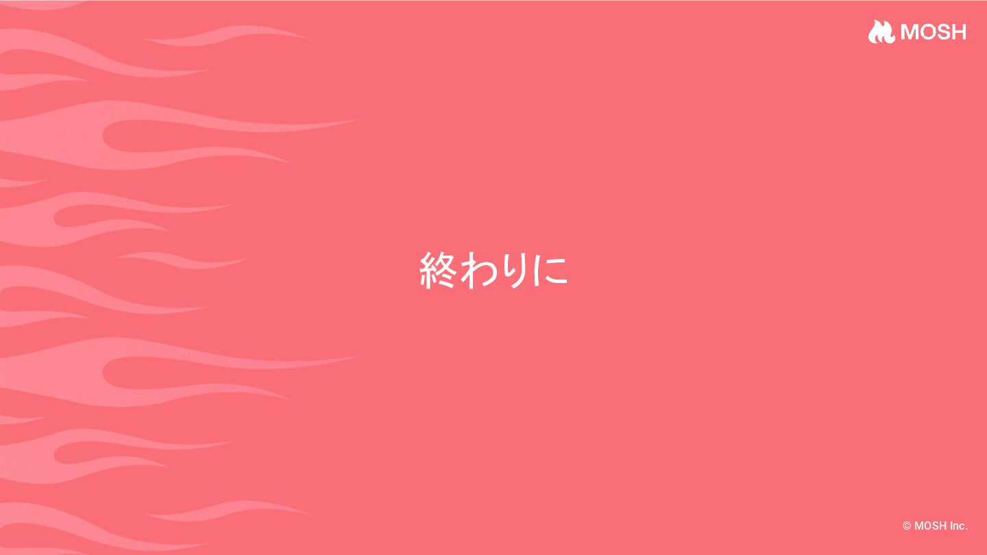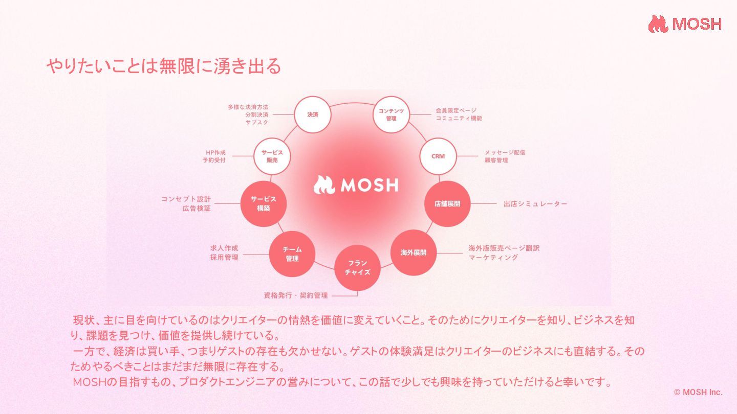 やりたいことは無限に湧き出る © MOSH Inc. 現状、主に目を向けているのはクリエイターの情熱を価値に変えていくこと。そのためにクリエイターを知り、ビジネスを知 り、課題を見つけ、価値を提供し続けている。 一方で、経済は買い手、つまりゲストの存在も欠かせない。ゲストの体験満足はクリエイターのビジネスにも直結する。その ためやるべきことはまだまだ無限に存在する。 MOSHの目指すもの、プロダクトエンジニアの営みについて、この話で少しでも興味を持っていただけると幸いです。