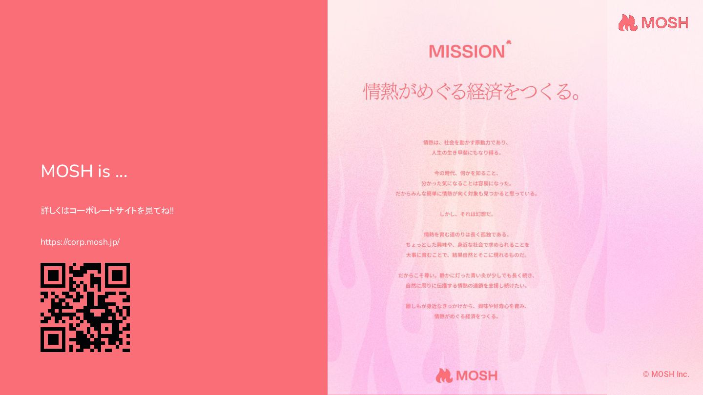 © MOSH Inc. MOSH is … 詳しくはコーポレートサイトを見てね!! https://corp.mosh.jp/