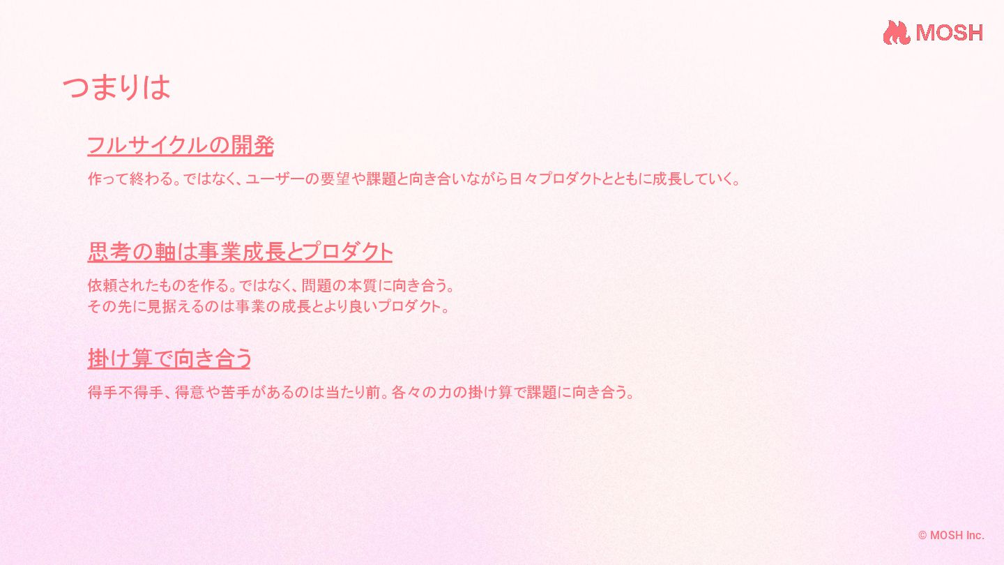 つまりは © MOSH Inc. フルサイクルの開発 作って終わる。ではなく、ユーザーの要望や課題と向き合いながら日々プロダクトとともに成長していく。 思考の軸は事業成長とプロダクト 依頼されたものを作る。ではなく、問題の本質に向き合う。 その先に見据えるのは事業の成長とより良いプロダクト。 掛け算で向き合う