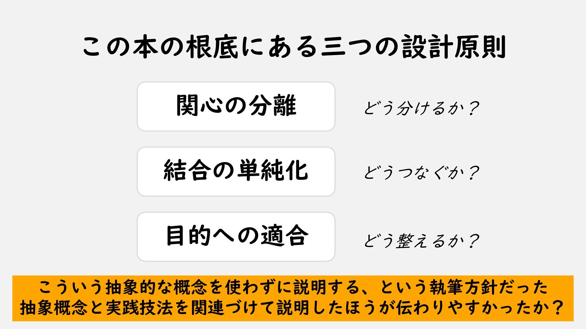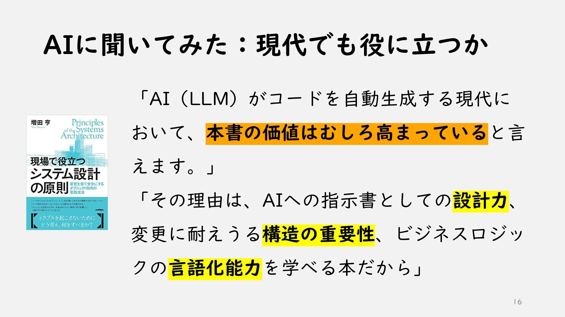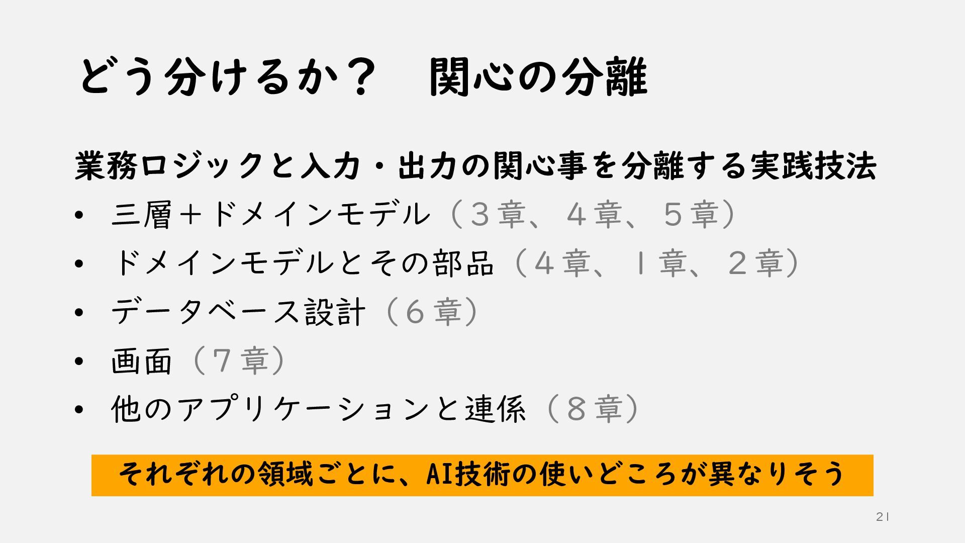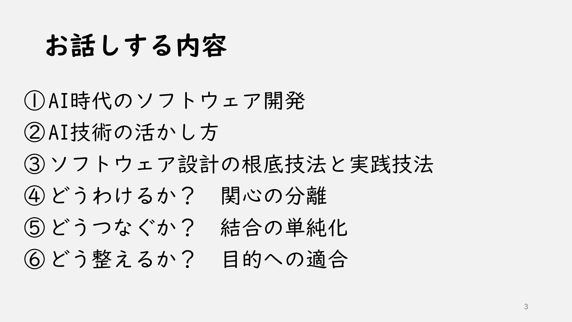 ①AI時代のソフトウェア開発 ②AI技術の活かし方 ③ソフトウェア設計の根底技法と実践技法 ④どうわけるか? 関心の分離 ⑤どうつなぐか? 結合の単純化 ⑥どう整えるか? 目的への適合