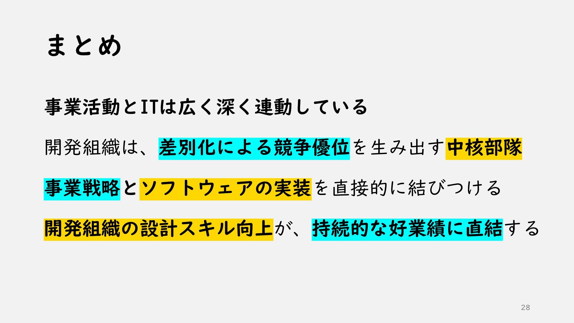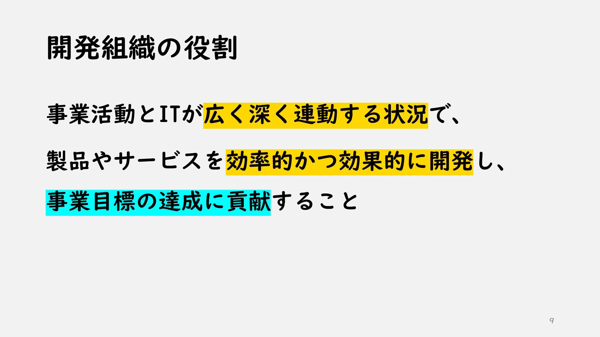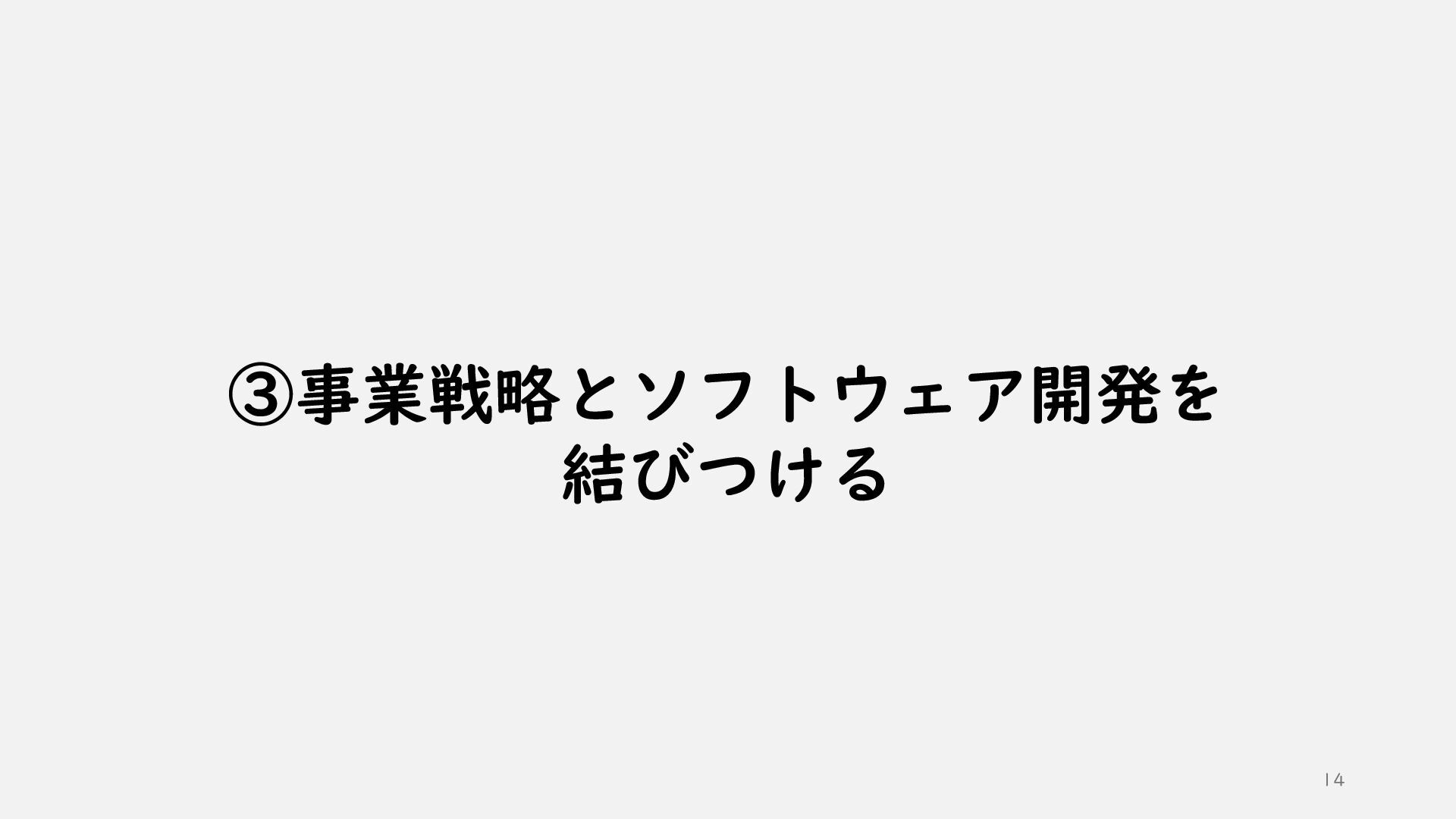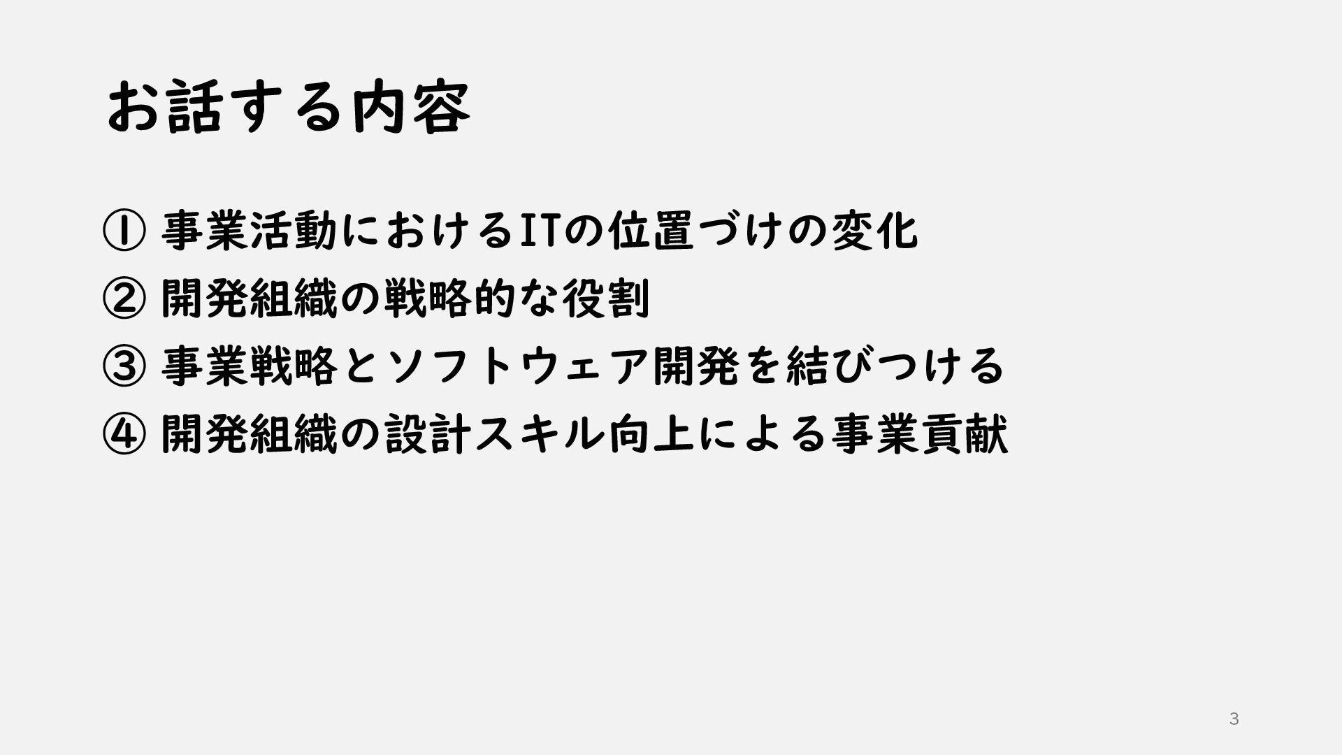 ①事業活動におけるITの位置づけの変化 ②開発組織の戦略的な役割 ③事業戦略とソフトウェア開発を結びつける ④開発組織の設計スキル向上による事業貢献