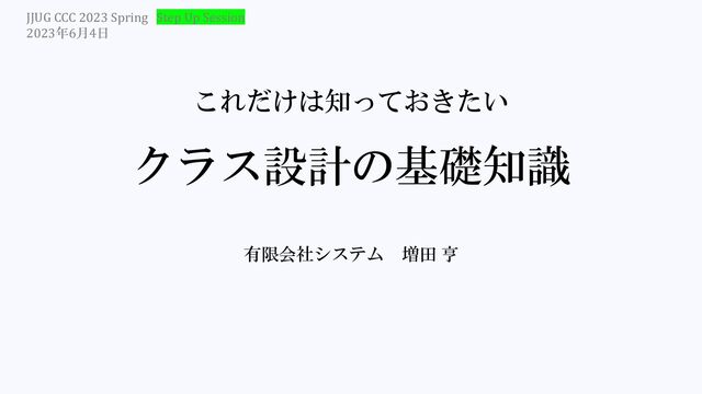 JJUG CCC 2023 Spring 発表資料(ステップアップセッション)。 私がクラス設計をするときに重視している考え方とやり方を紹介。 主な内容 ・クラス設計のスキル 3段階 ・クラス設計の技能を習得するシナリオ ・7つの基礎知識 ① 入出力と計算判断 ② プログラムの中核と周辺 ③ モジュラー性 ④ データ抽象 ⑤ カプセル化 ⑥ 契約プログラミング ⑦ 不変(イミュータブル)