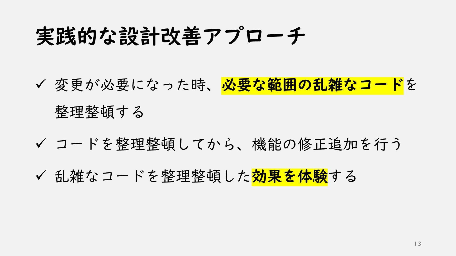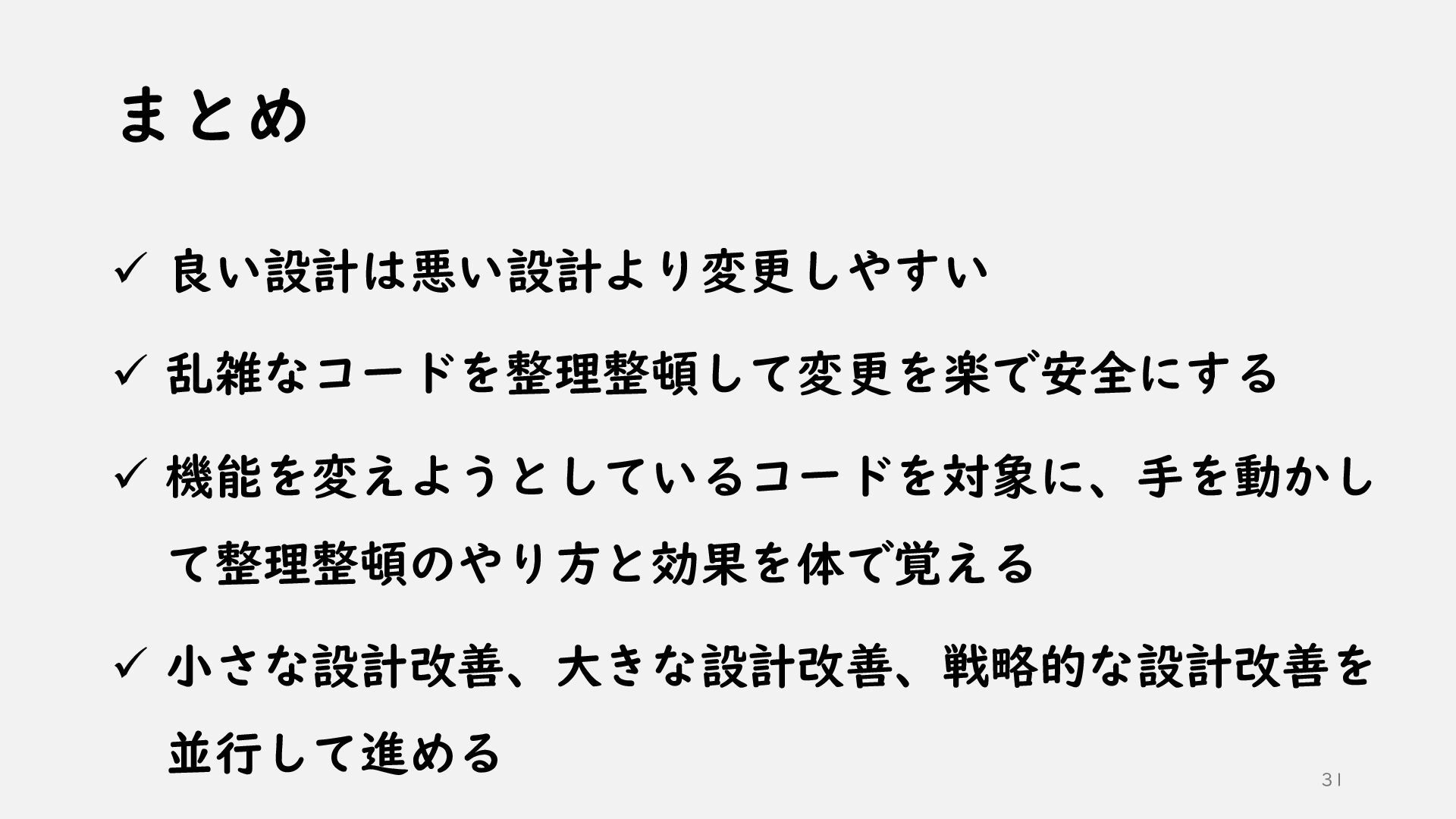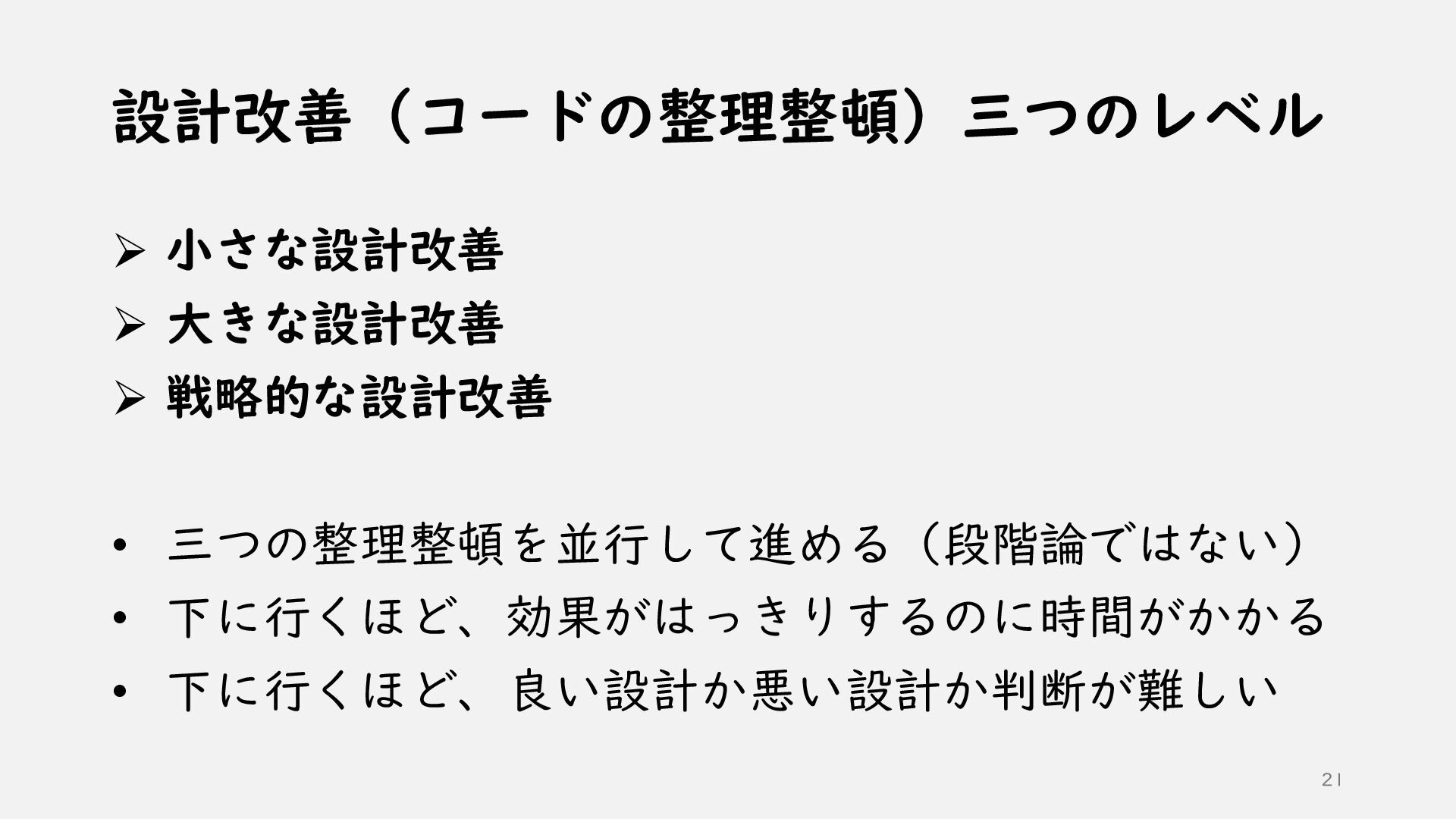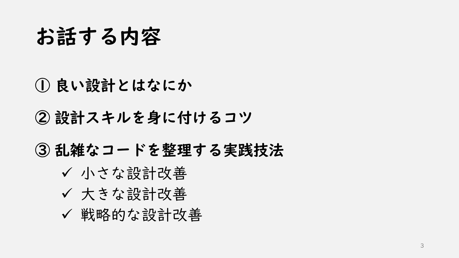 1. 良い設計とはなにか 2. 設計スキルを身に付けるコツ 3. 乱雑なコードを整理する実践技法 - 小さな設計改善 - 大きな設計改善 - 戦略的な設計改善