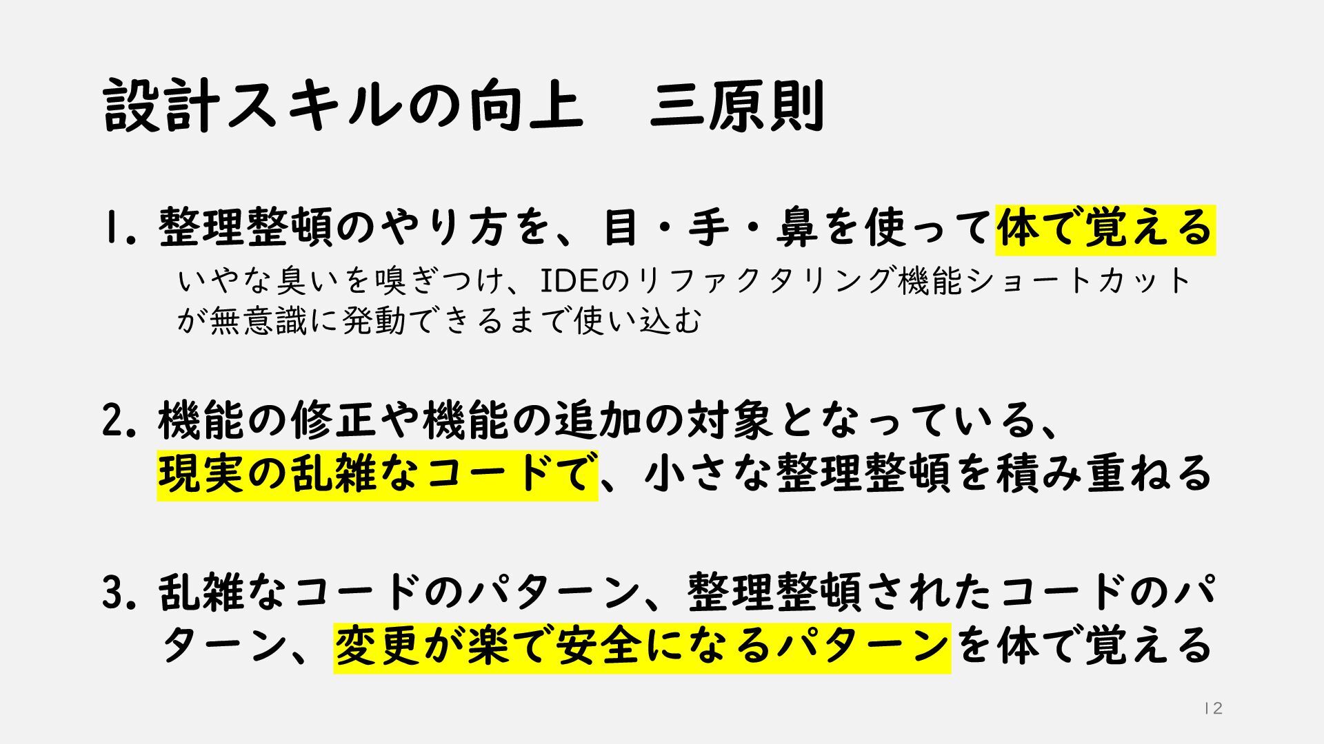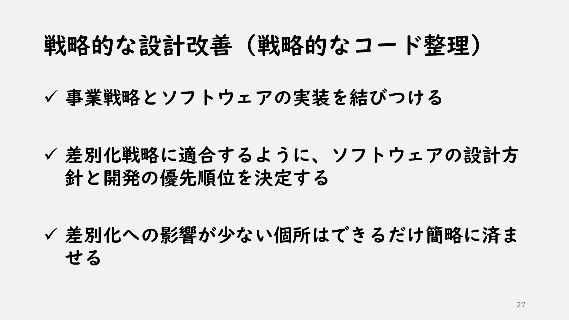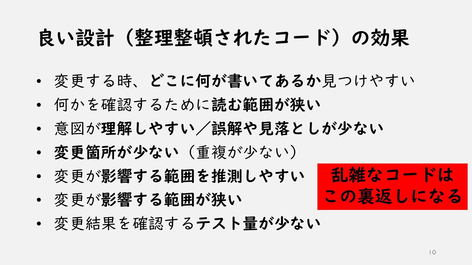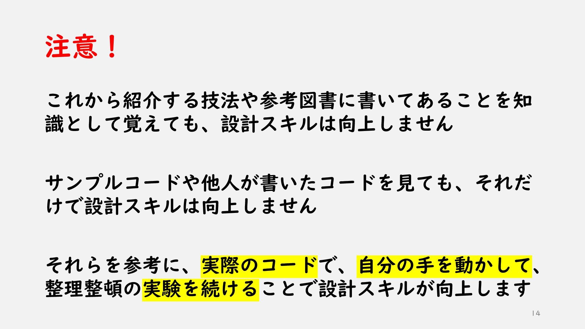 1. 良い設計とはなにか 2. 設計スキルを身に付けるコツ 3. 乱雑なコードを整理する実践技法 - 小さな設計改善 - 大きな設計改善 - 戦略的な設計改善