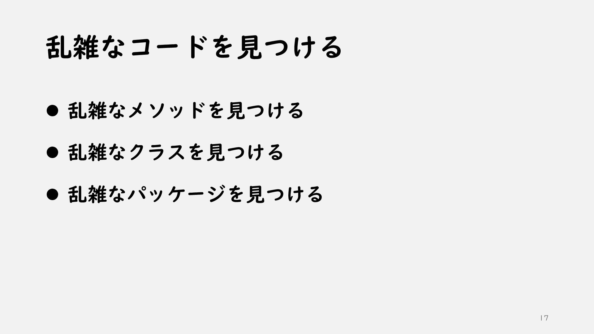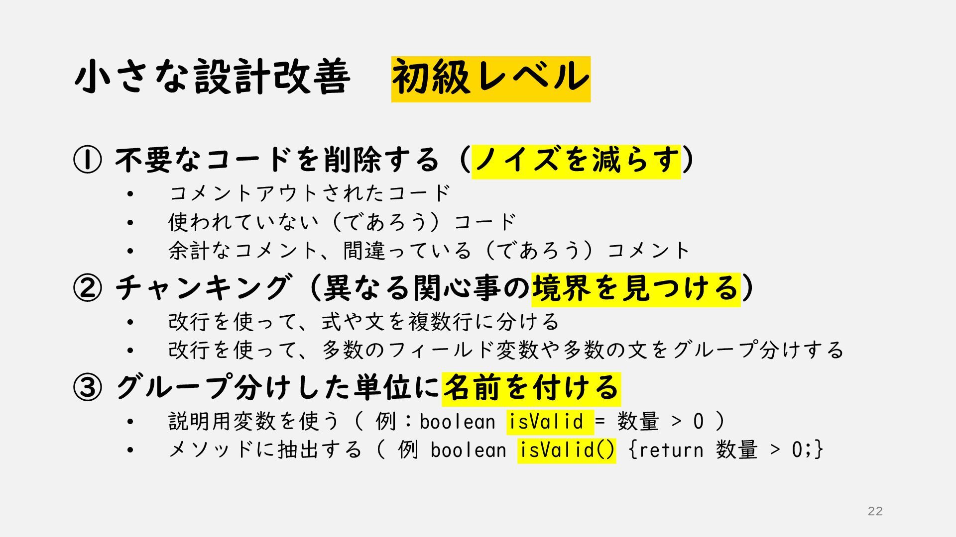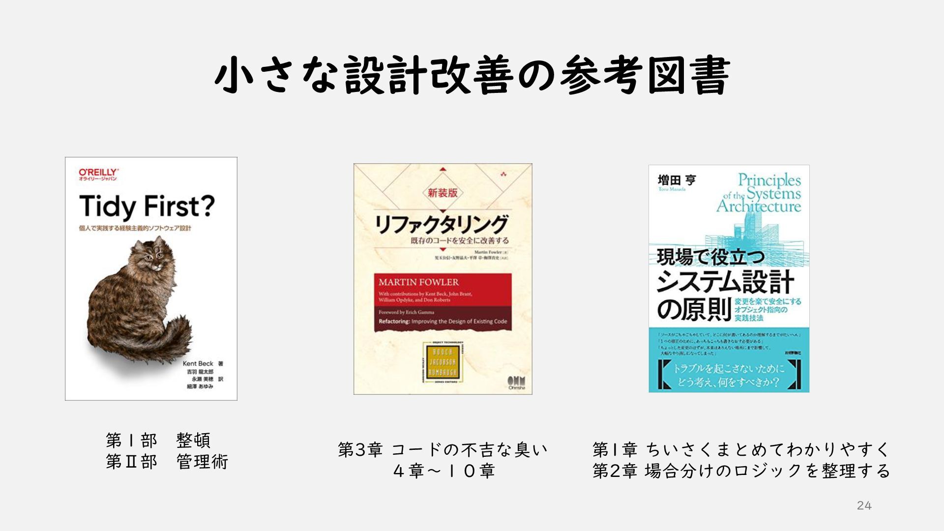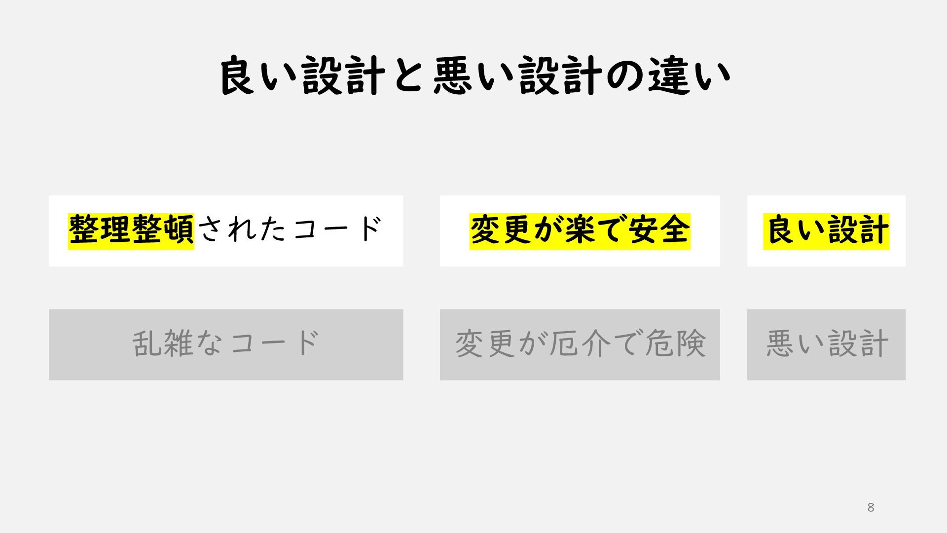 1. 良い設計とはなにか 2. 設計スキルを身に付けるコツ 3. 乱雑なコードを整理する実践技法 - 小さな設計改善 - 大きな設計改善 - 戦略的な設計改善