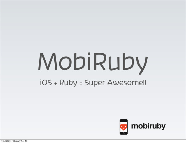 "Hello", :message, "I am MobiRuby", :delegate, nil, :cancelButtonTitle, "I know!", :otherButtonTitles, "What's?", nil alert._setDelegate alert alert._show alert = Cocoa::MyAlertView._alloc. _initWithTitle "Hello", :message, "I am MobiRuby", :delegate, nil, :cancelButtonTitle, "I know!", :otherButtonTitles, "What's?", nil alert._setDelegate alert alert._show Thursday, February 14, 13