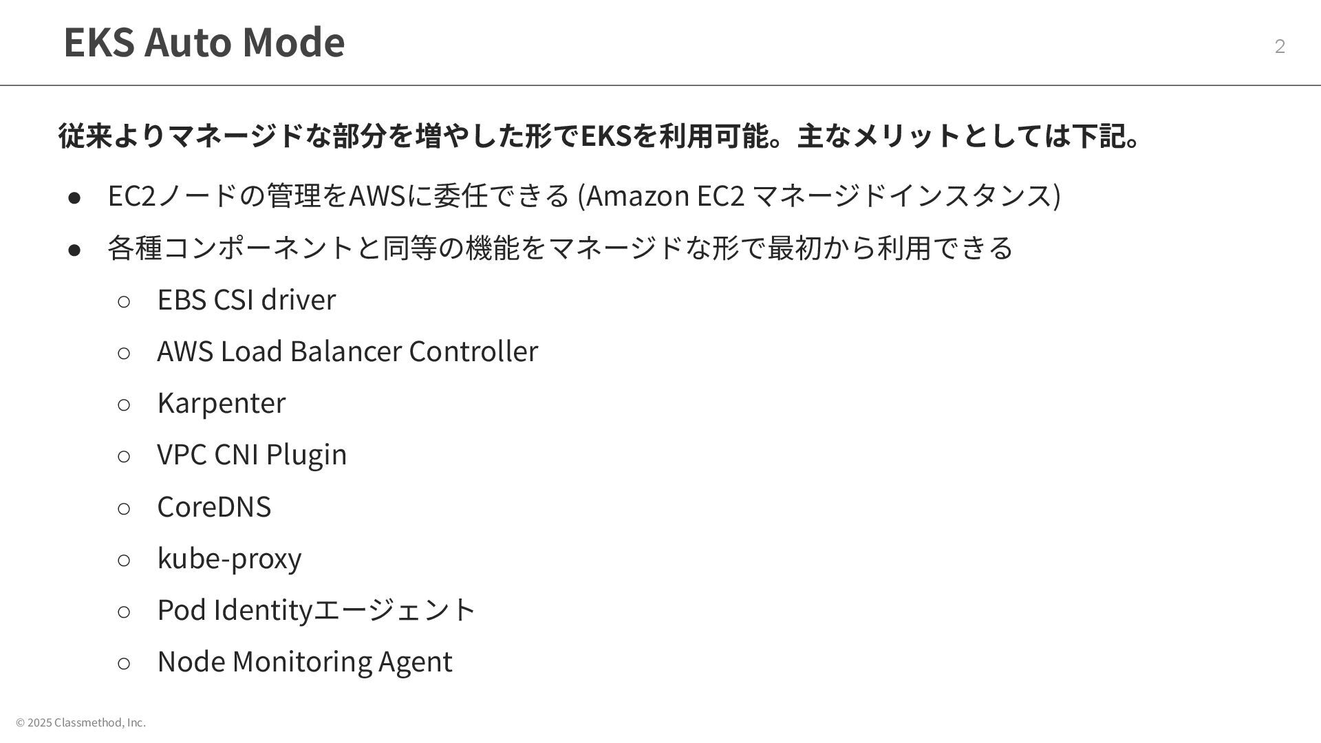 © 2025 Classmethod, Inc. EKS Auto Mode 2 従来よりマネージドな部分を増やした形でEKSを利⽤可能。主なメリットとしては下記。 •