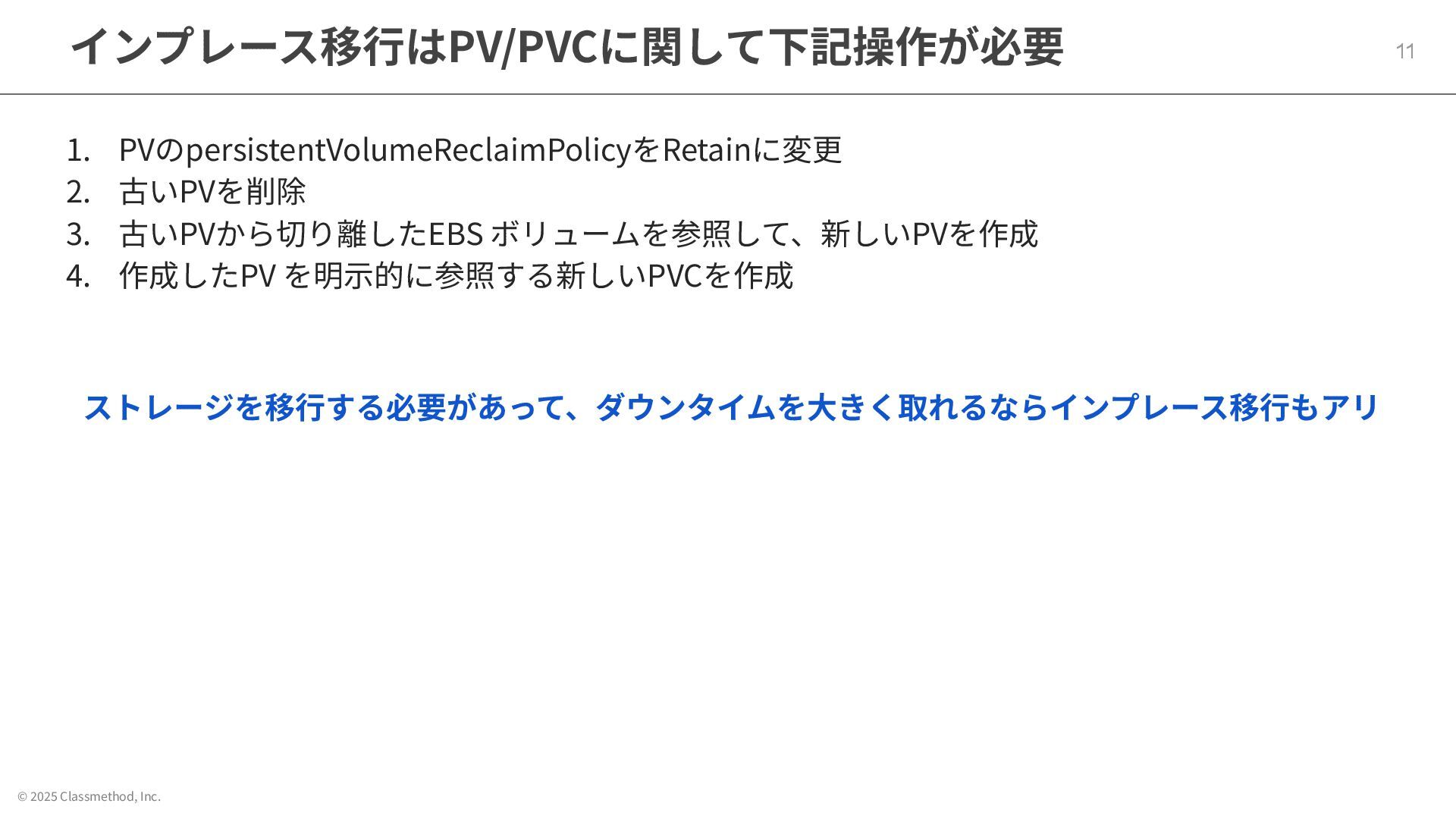 © 2025 Classmethod, Inc. インプレース移⾏はPV/PVCに関して下記操作が必要 11 1. PVのpersistentVolumeReclaimPolicyをRetainに変更 2. 古いPVを削除