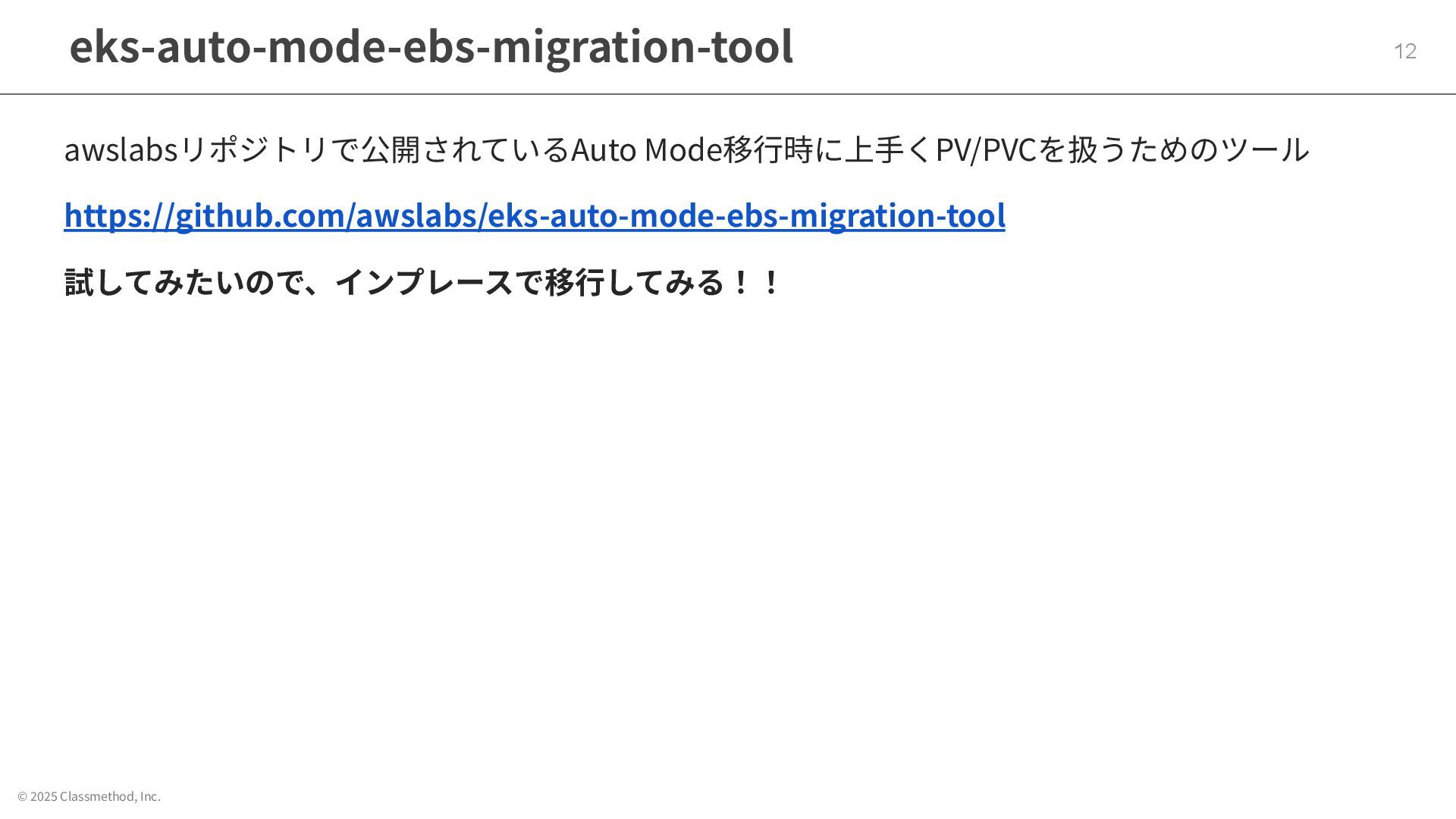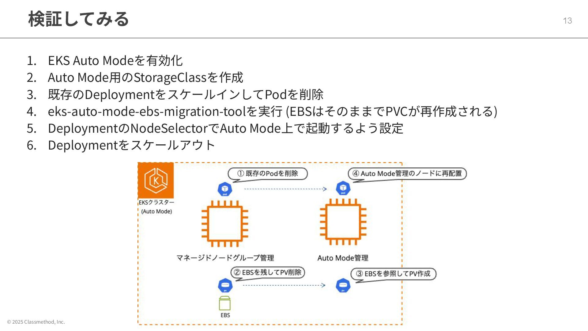 © 2025 Classmethod, Inc. eks-auto-mode-ebs-migration-tool 12 awslabsリポジトリで公開されているAuto Mode移⾏時に上⼿くPV/PVCを扱うためのツール https://github.com/awslabs/eks-auto-mode-ebs-migration-tool 試してみたいので、インプレースで移⾏してみる!!