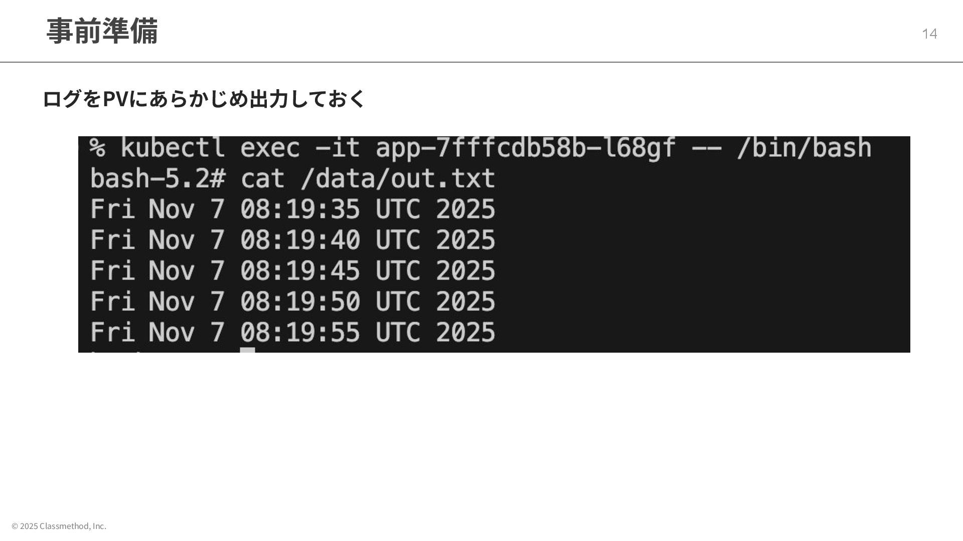 © 2025 Classmethod, Inc. 事前準備 14 ログをPVにあらかじめ出⼒しておく