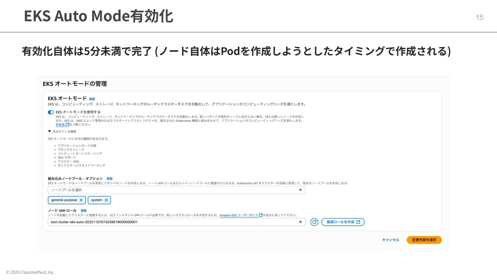 © 2025 Classmethod, Inc. EKS Auto Mode有効化 15 有効化⾃体は5分未満で完了 (ノード⾃体はPodを作成しようとしたタイミングで作成される)