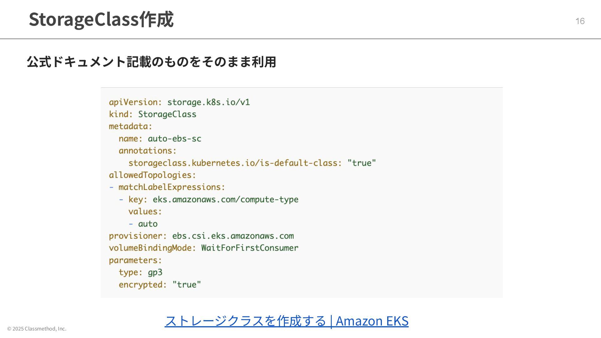 © 2025 Classmethod, Inc. StorageClass作成 16 公式ドキュメント記載のものをそのまま利⽤ ストレージクラスを作成する | Amazon