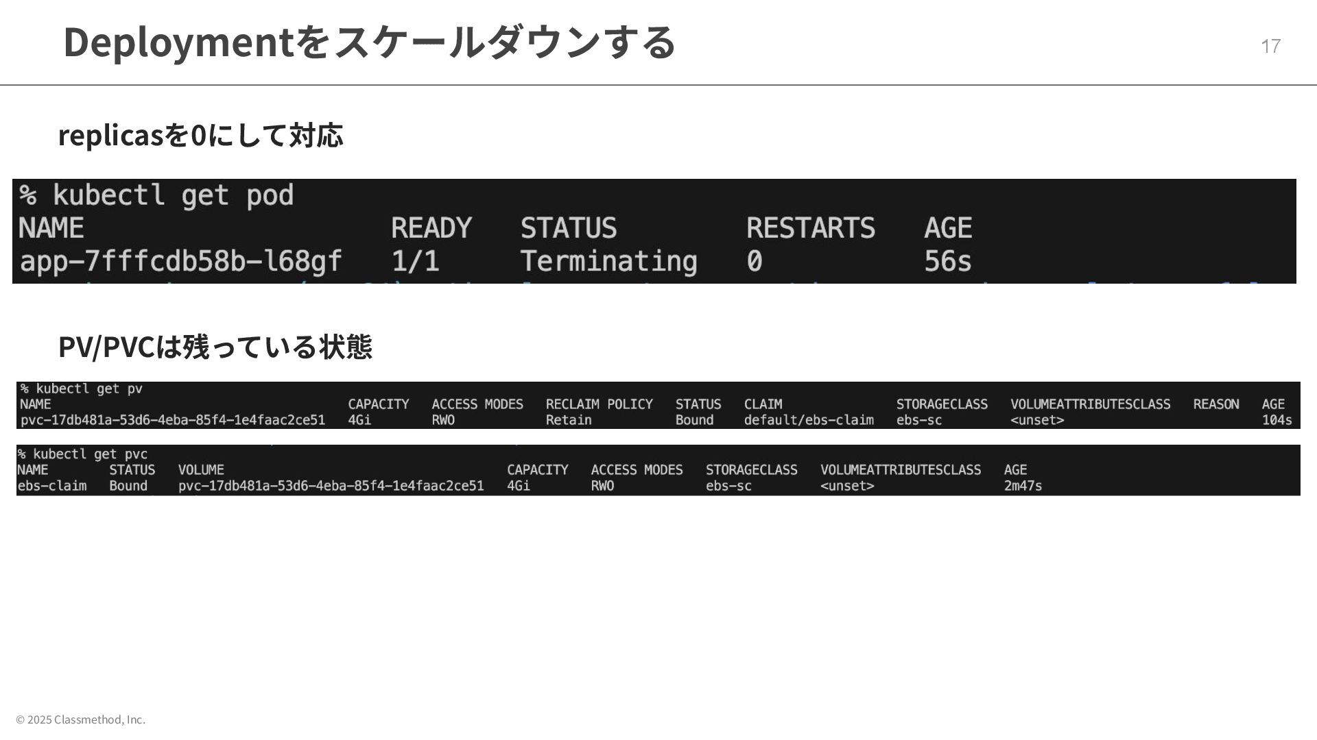 © 2025 Classmethod, Inc. Deploymentをスケールダウンする 17 replicasを0にして対応 PV/PVCは残っている状態
