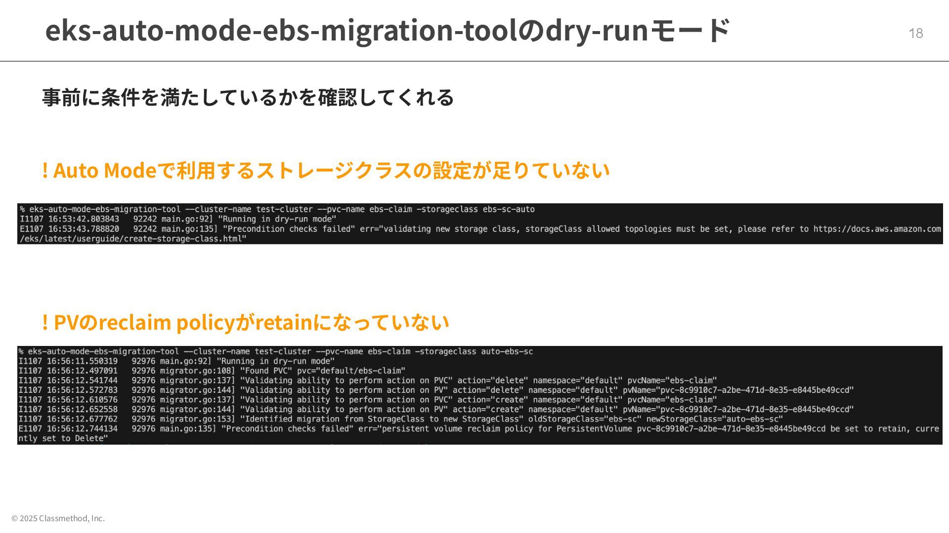 © 2025 Classmethod, Inc. eks-auto-mode-ebs-migration-toolのdry-runモード 18 ! Auto Modeで利⽤するストレージクラスの設定が⾜りていない !