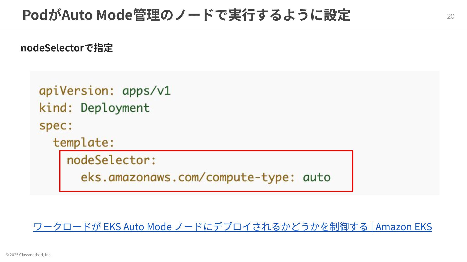 © 2025 Classmethod, Inc. PodがAuto Mode管理のノードで実⾏するように設定 20 nodeSelectorで指定 ワークロードが EKS