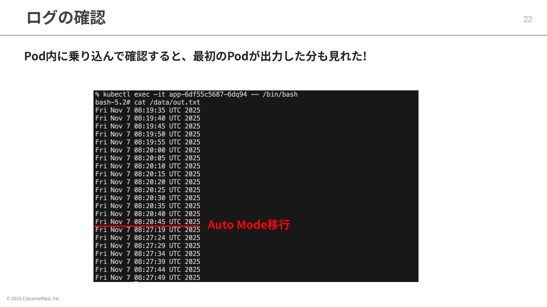 © 2025 Classmethod, Inc. ログの確認 22 Pod内に乗り込んで確認すると、最初のPodが出⼒した分も⾒れた! Auto Mode移⾏