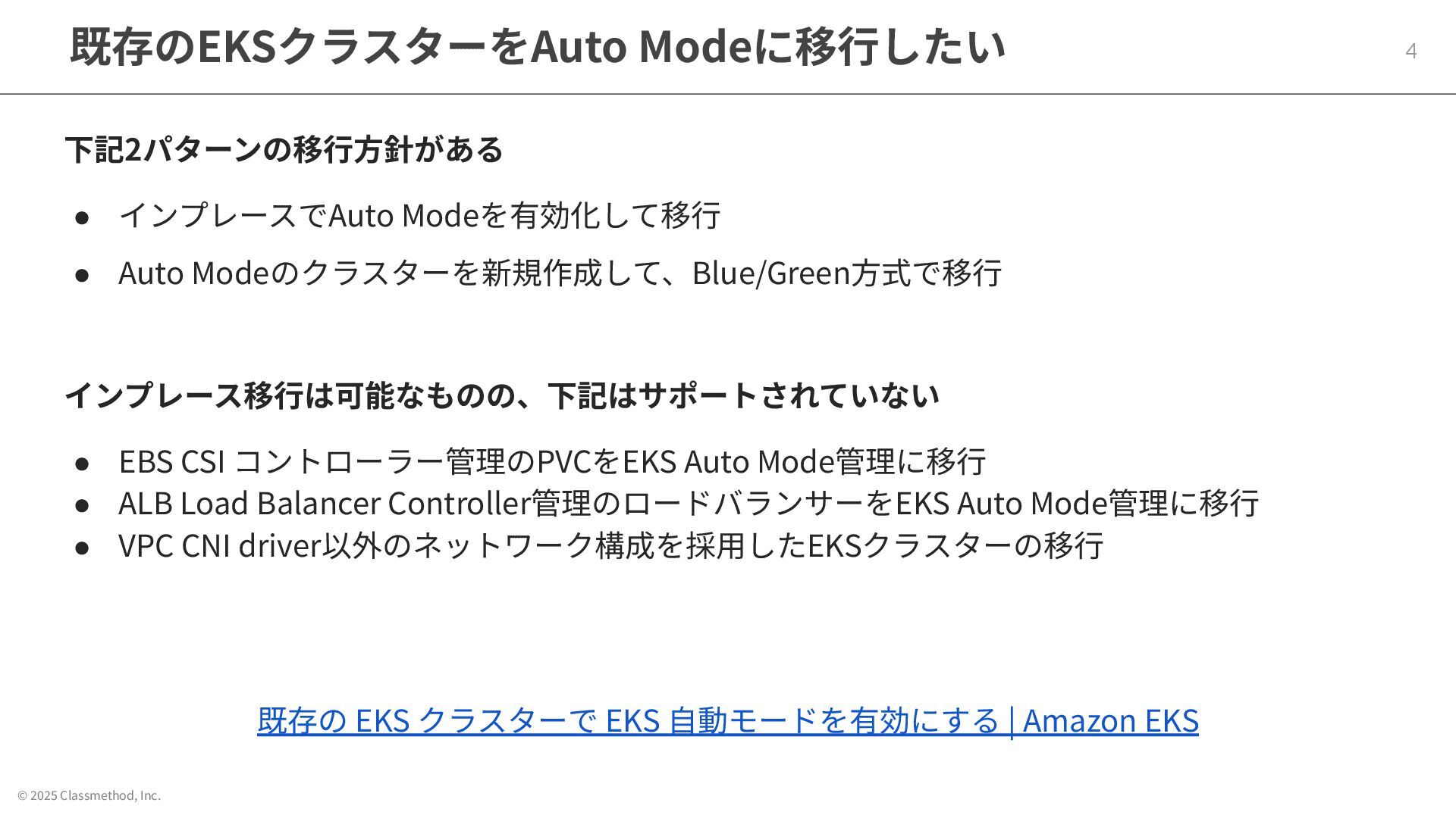 © 2025 Classmethod, Inc. 既存のEKSクラスターをAuto Modeに移⾏したい 4 下記2パターンの移⾏⽅針がある • インプレースでAuto