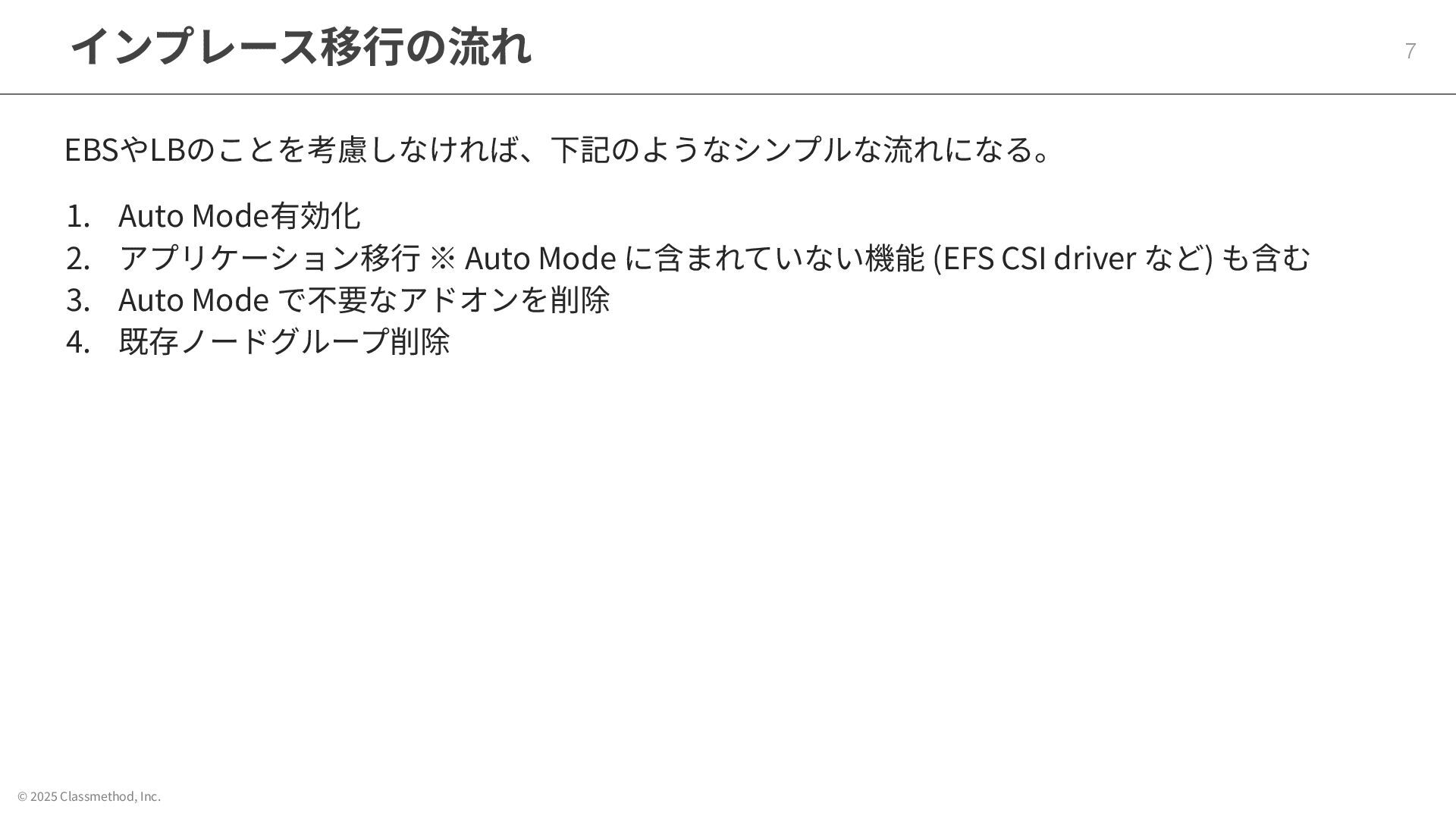 © 2025 Classmethod, Inc. インプレース移⾏の流れ 7 EBSやLBのことを考慮しなければ、下記のようなシンプルな流れになる。 1. Auto Mode有効化
