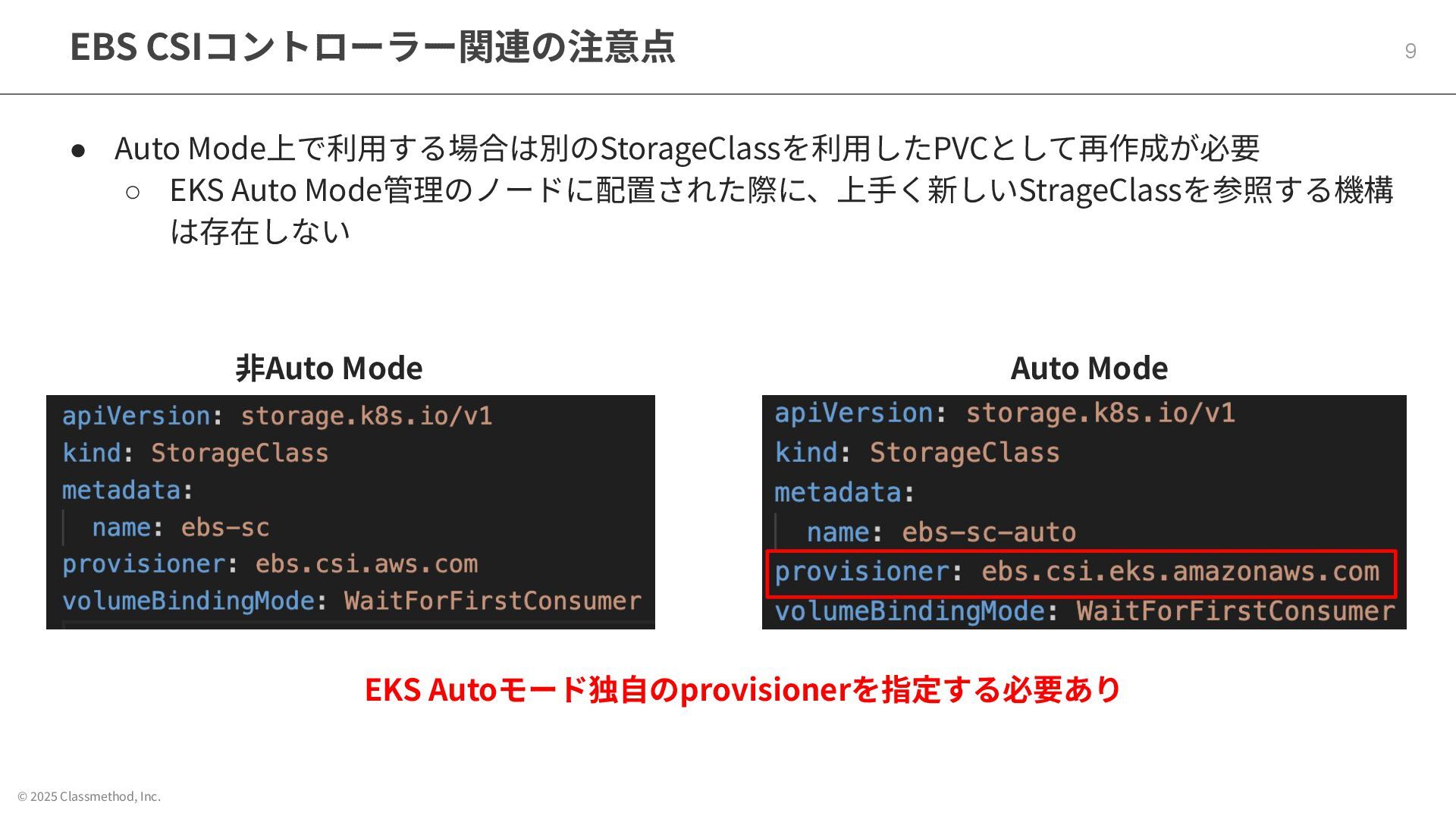 © 2025 Classmethod, Inc. EBS CSIコントローラー関連の注意点 9 • Auto Mode上で利⽤する場合は別のStorageClassを利⽤したPVCとして再作成が必要