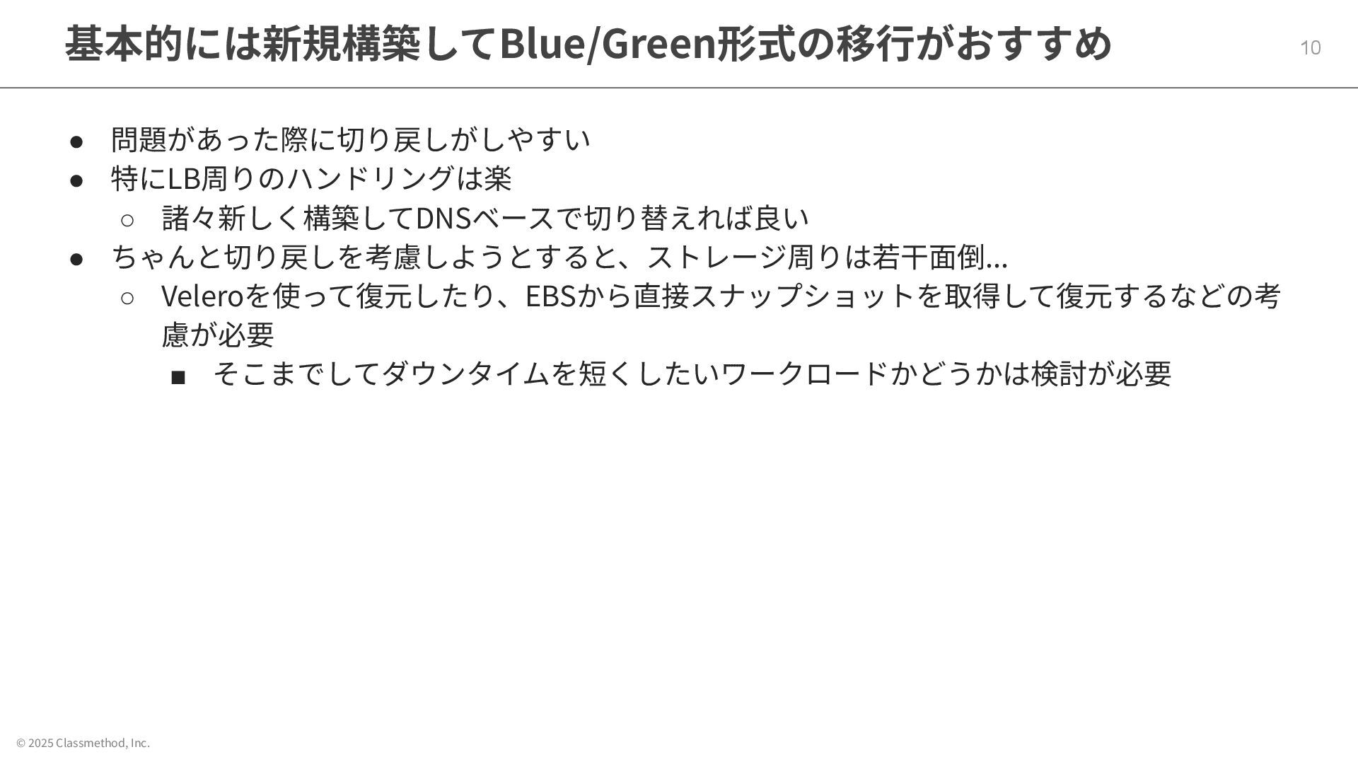 © 2025 Classmethod, Inc. 基本的には新規構築してBlue/Green形式の移⾏がおすすめ 10 • 問題があった際に切り戻しがしやすい • 特にLB周りのハンドリングは楽
