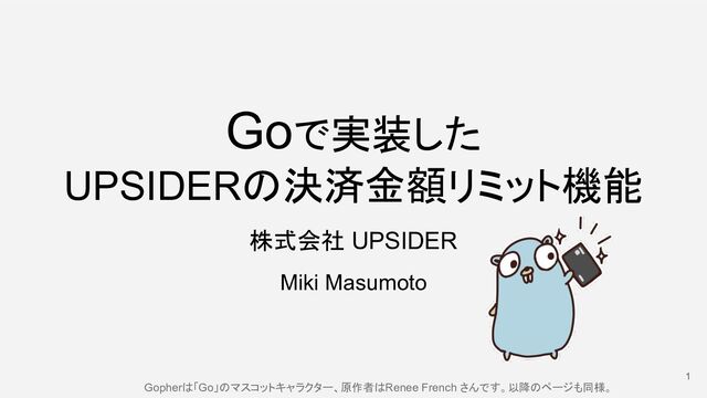 Goで実装した UPSIDERの決済金額リミット機能 株式会社 UPSIDER Miki Masumoto 1 Gopherは「Go」のマスコットキャラクター、原作者は Renee French
