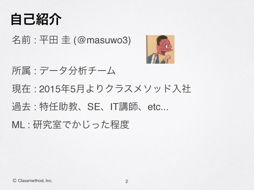 σʔλੳνʔϜ ݱࡏ : 20155݄ΑΓΫϥεϝιουೖࣾ աڈ : ಛॿڭɺSEɺITߨࢣɺetc... ML : ݚڀࣨͰ͔ͬͨ͡ఔ