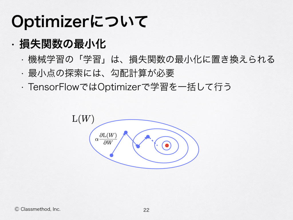 ⡥$MBTTNFUIPE *OD 0QUJNJ[FSʹ͍ͭͯ w ଛࣦؔͷ࠷খԽ w ػցֶशͷʮֶशʯɺଛࣦؔͷ࠷খԽʹஔ͖͑ΒΕΔ w ࠷খͷ୳ࡧʹɺޯܭࢉ͕ඞཁ w