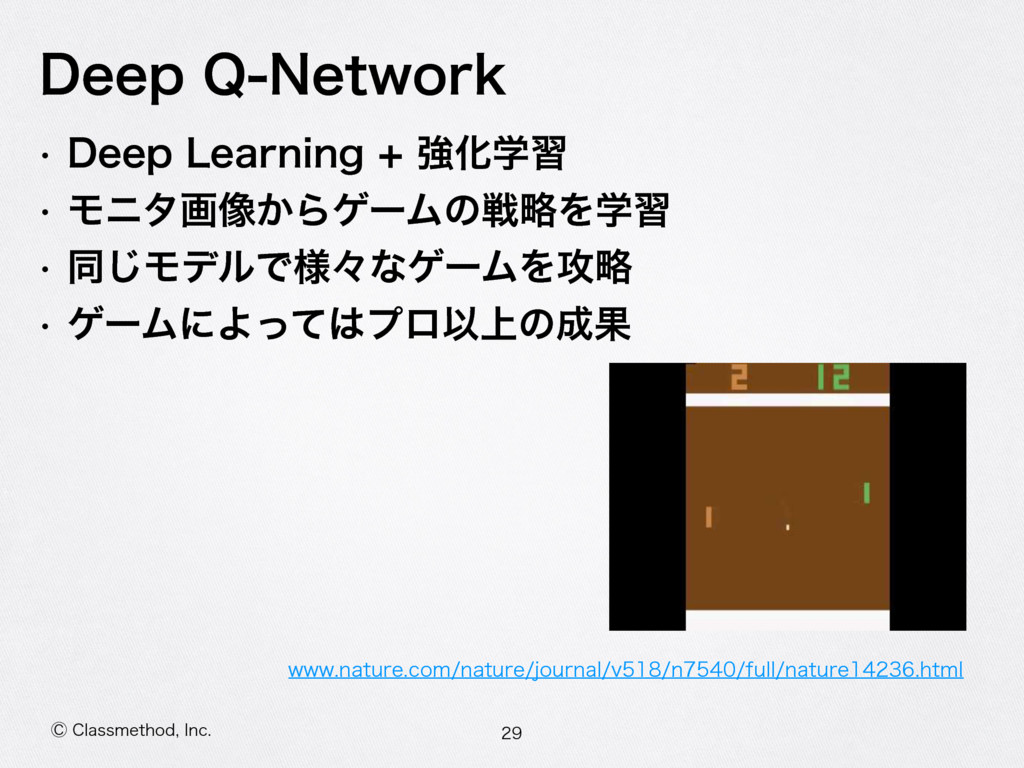 ⡥$MBTTNFUIPE *OD %FFQ2/FUXPSL w %FFQ-FBSOJOH ڧԽֶश w Ϟχλը૾͔ΒήʔϜͷઓུΛֶश w ಉ͡ϞσϧͰ༷ʑͳήʔϜΛ߈ུ