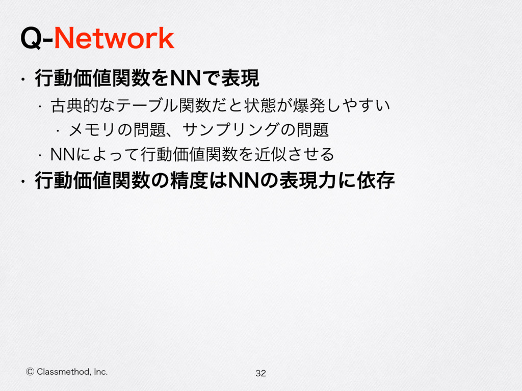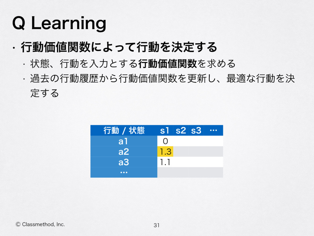 ⡥$MBTTNFUIPE *OD 2-FBSOJOH w ߦಈՁؔʹΑͬͯߦಈΛܾఆ͢Δ w ঢ়ଶɺߦಈΛೖྗͱ͢ΔߦಈՁؔΛٻΊΔ w աڈͷߦಈཤྺ͔ΒߦಈՁؔΛߋ৽͠ɺ࠷దͳߦಈΛܾ ఆ͢Δ