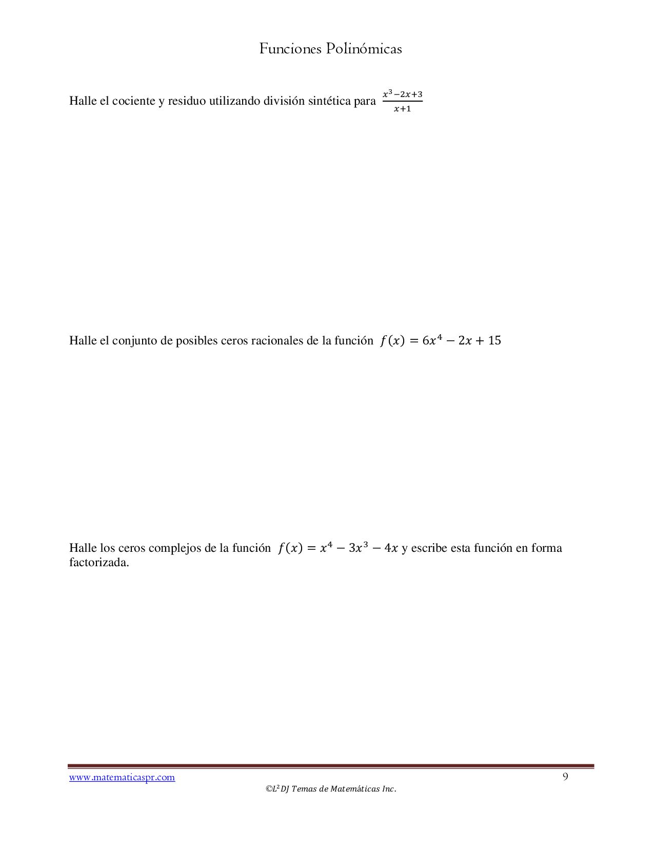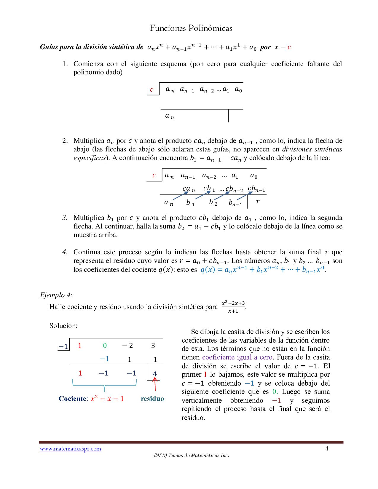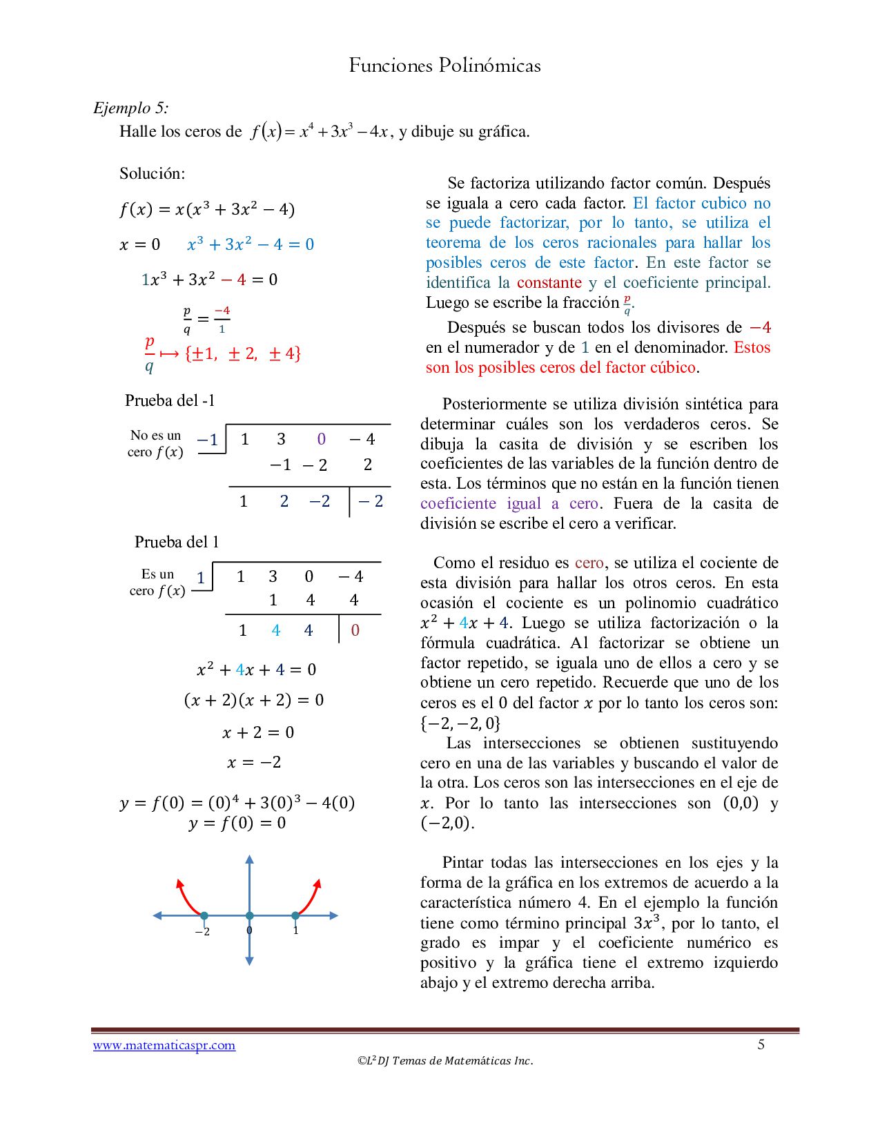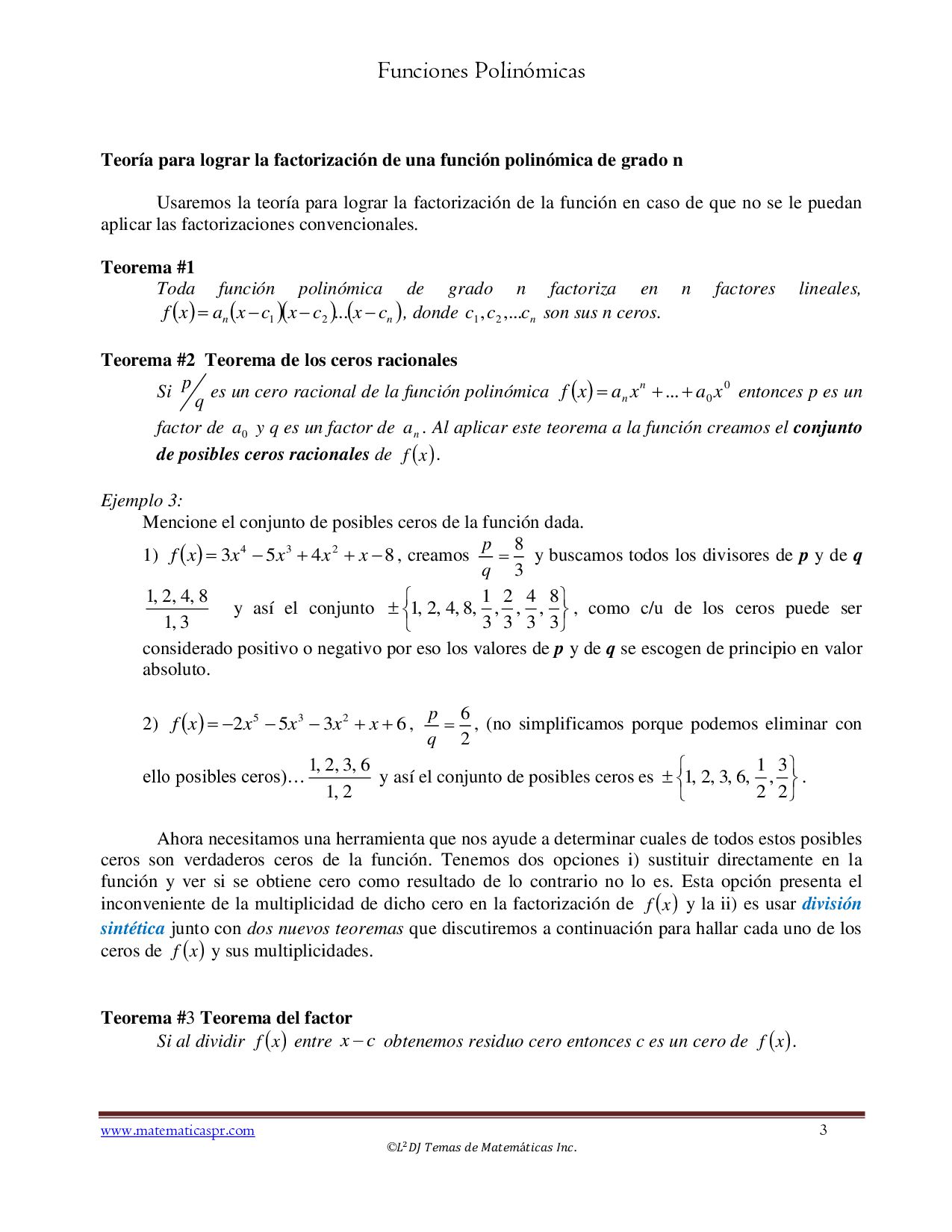 de una función polinómica de grado n Usaremos la teoría para lograr la factorización de la función en caso de que no se le puedan aplicar las factorizaciones convencionales. Teorema #1 Toda función polinómica de grado n factoriza en n factores lineales, n n c x c x c x a x f ... 2 1 , donde n c c c ,... , 2 1 son sus n ceros. Teorema #2 Teorema de los ceros racionales Si q p es un cero racional de la función polinómica 0 0 ... x a x a x f n n entonces p es un factor de 0 a y q es un factor de n a . Al aplicar este teorema a la función creamos el conjunto de posibles ceros racionales de x f . Ejemplo 3: Mencione el conjunto de posibles ceros de la función dada. 1) 8 4 5 3 2 3 4 x x x x x f , creamos 3 8 q p y buscamos todos los divisores de p y de q 3 , 1 8 , 4 , 2 , 1 y así el conjunto 3 8 , 3 4 , 3 2 , 3 1 , 8 , 4 , 2 , 1 , como c/u de los ceros puede ser considerado positivo o negativo por eso los valores de p y de q se escogen de principio en valor absoluto. 2) 6 3 5 2 2 3 5 x x x x x f , 2 6 q p , (no simplificamos porque podemos eliminar con ello posibles ceros)… 2 , 1 6 , 3 , 2 , 1 y así el conjunto de posibles ceros es 2 3 , 2 1 , 6 , 3 , 2 , 1 . Ahora necesitamos una herramienta que nos ayude a determinar cuales de todos estos posibles ceros son verdaderos ceros de la función. Tenemos dos opciones i) sustituir directamente en la función y ver si se obtiene cero como resultado de lo contrario no lo es. Esta opción presenta el inconveniente de la multiplicidad de dicho cero en la factorización de x f y la ii) es usar división sintética junto con dos nuevos teoremas que discutiremos a continuación para hallar cada uno de los ceros de x f y sus multiplicidades. Teorema #3 Teorema del factor Si al dividir x f entre c x obtenemos residuo cero entonces c es un cero de x f .