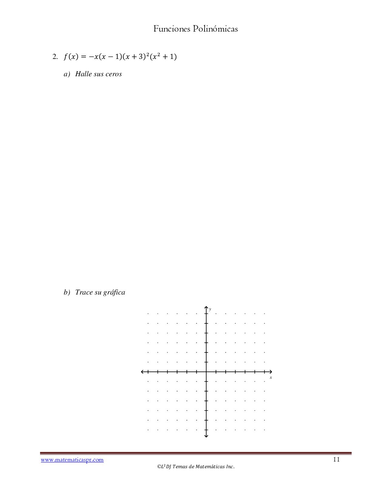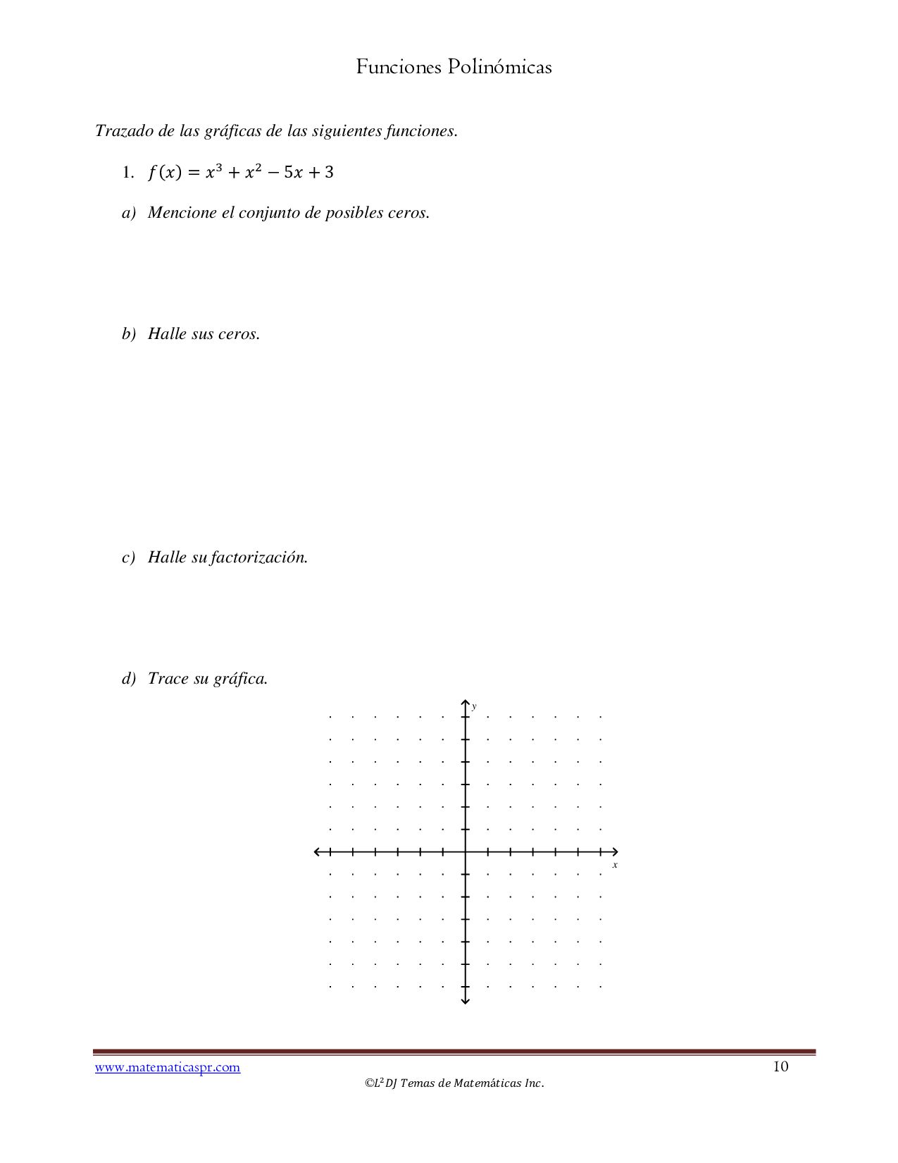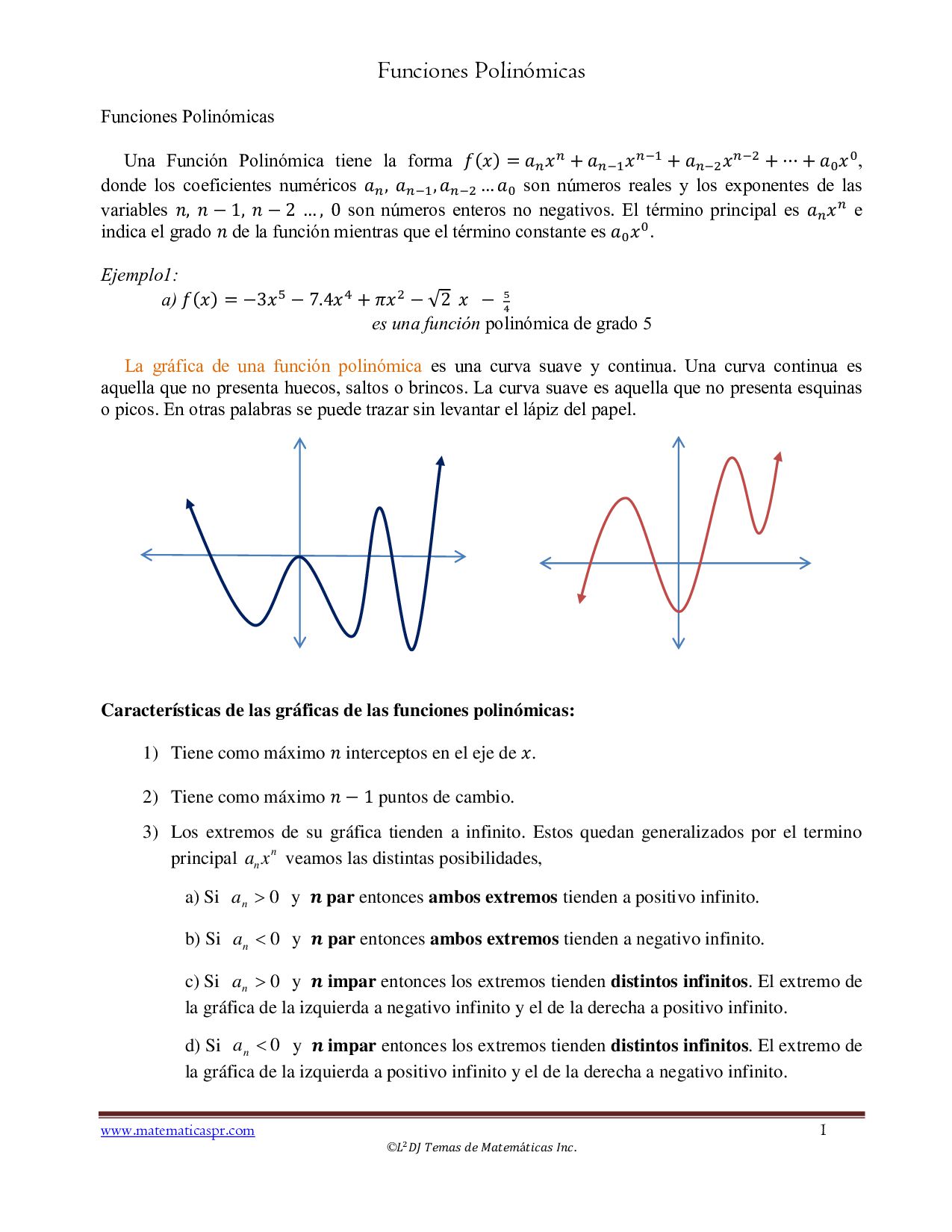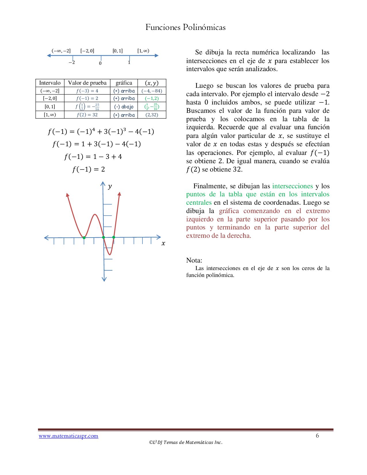 de una función polinómica de grado n Usaremos la teoría para lograr la factorización de la función en caso de que no se le puedan aplicar las factorizaciones convencionales. Teorema #1 Toda función polinómica de grado n factoriza en n factores lineales, n n c x c x c x a x f ... 2 1 , donde n c c c ,... , 2 1 son sus n ceros. Teorema #2 Teorema de los ceros racionales Si q p es un cero racional de la función polinómica 0 0 ... x a x a x f n n entonces p es un factor de 0 a y q es un factor de n a . Al aplicar este teorema a la función creamos el conjunto de posibles ceros racionales de x f . Ejemplo 3: Mencione el conjunto de posibles ceros de la función dada. 1) 8 4 5 3 2 3 4 x x x x x f , creamos 3 8 q p y buscamos todos los divisores de p y de q 3 , 1 8 , 4 , 2 , 1 y así el conjunto 3 8 , 3 4 , 3 2 , 3 1 , 8 , 4 , 2 , 1 , como c/u de los ceros puede ser considerado positivo o negativo por eso los valores de p y de q se escogen de principio en valor absoluto. 2) 6 3 5 2 2 3 5 x x x x x f , 2 6 q p , (no simplificamos porque podemos eliminar con ello posibles ceros)… 2 , 1 6 , 3 , 2 , 1 y así el conjunto de posibles ceros es 2 3 , 2 1 , 6 , 3 , 2 , 1 . Ahora necesitamos una herramienta que nos ayude a determinar cuales de todos estos posibles ceros son verdaderos ceros de la función. Tenemos dos opciones i) sustituir directamente en la función y ver si se obtiene cero como resultado de lo contrario no lo es. Esta opción presenta el inconveniente de la multiplicidad de dicho cero en la factorización de x f y la ii) es usar división sintética junto con dos nuevos teoremas que discutiremos a continuación para hallar cada uno de los ceros de x f y sus multiplicidades. Teorema #3 Teorema del factor Si al dividir x f entre c x obtenemos residuo cero entonces c es un cero de x f .