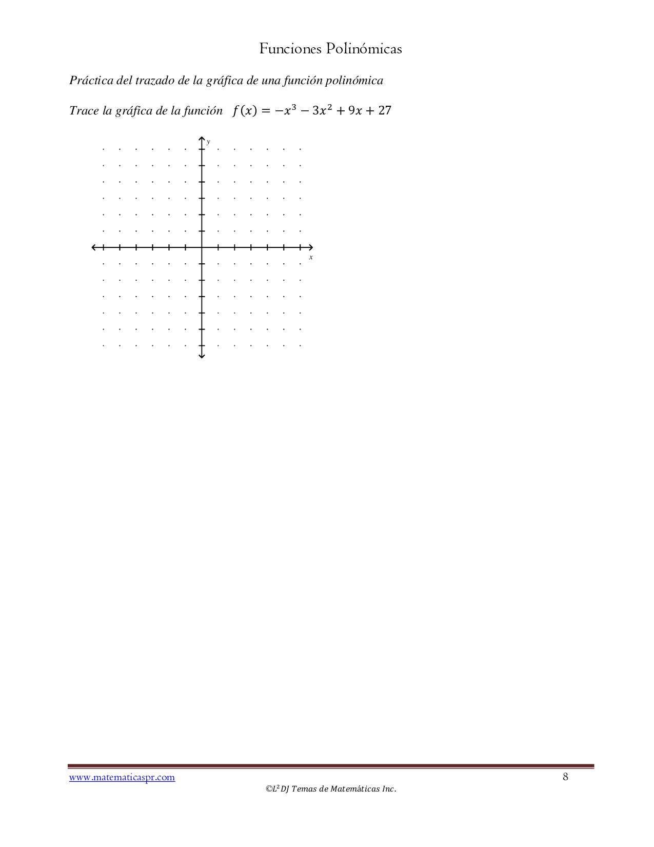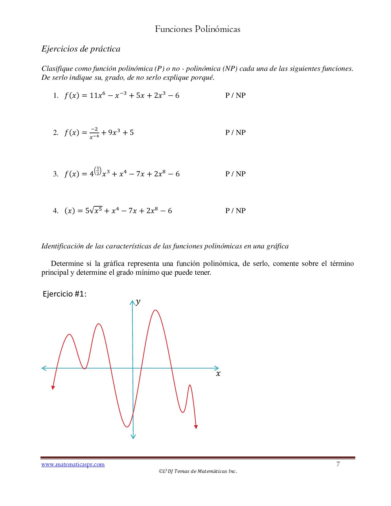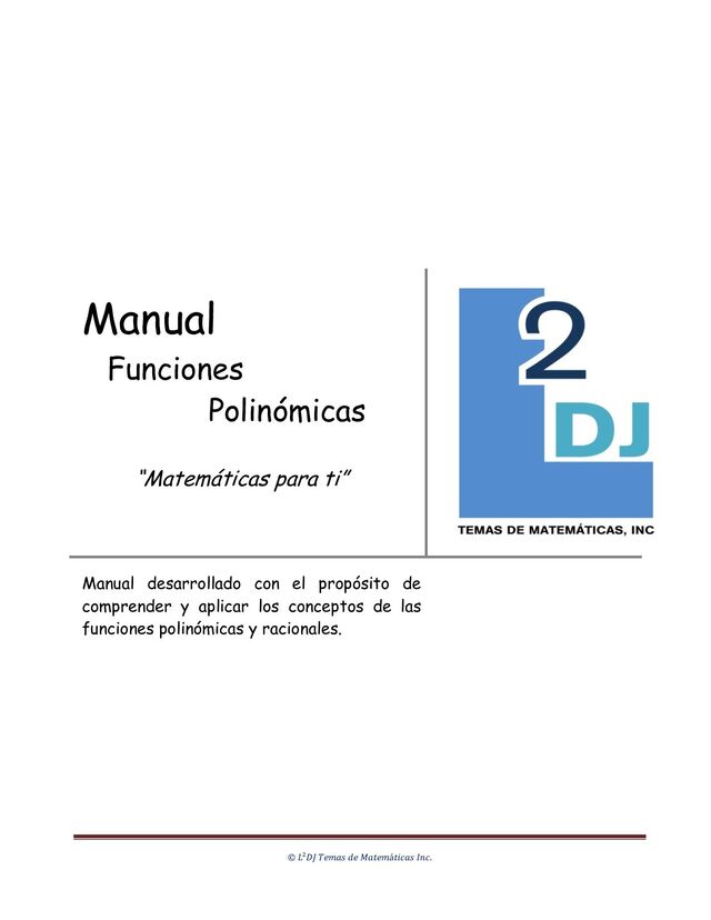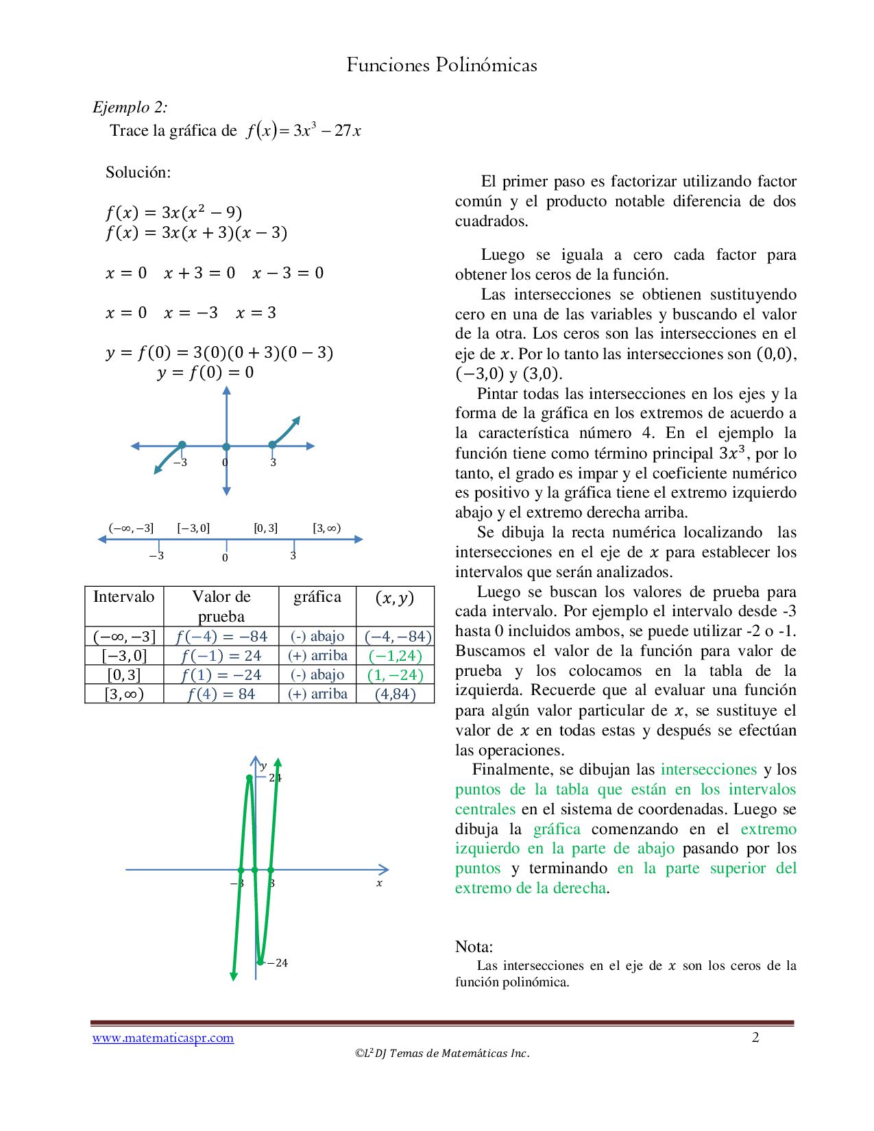 de una función polinómica de grado n Usaremos la teoría para lograr la factorización de la función en caso de que no se le puedan aplicar las factorizaciones convencionales. Teorema #1 Toda función polinómica de grado n factoriza en n factores lineales, n n c x c x c x a x f ... 2 1 , donde n c c c ,... , 2 1 son sus n ceros. Teorema #2 Teorema de los ceros racionales Si q p es un cero racional de la función polinómica 0 0 ... x a x a x f n n entonces p es un factor de 0 a y q es un factor de n a . Al aplicar este teorema a la función creamos el conjunto de posibles ceros racionales de x f . Ejemplo 3: Mencione el conjunto de posibles ceros de la función dada. 1) 8 4 5 3 2 3 4 x x x x x f , creamos 3 8 q p y buscamos todos los divisores de p y de q 3 , 1 8 , 4 , 2 , 1 y así el conjunto 3 8 , 3 4 , 3 2 , 3 1 , 8 , 4 , 2 , 1 , como c/u de los ceros puede ser considerado positivo o negativo por eso los valores de p y de q se escogen de principio en valor absoluto. 2) 6 3 5 2 2 3 5 x x x x x f , 2 6 q p , (no simplificamos porque podemos eliminar con ello posibles ceros)… 2 , 1 6 , 3 , 2 , 1 y así el conjunto de posibles ceros es 2 3 , 2 1 , 6 , 3 , 2 , 1 . Ahora necesitamos una herramienta que nos ayude a determinar cuales de todos estos posibles ceros son verdaderos ceros de la función. Tenemos dos opciones i) sustituir directamente en la función y ver si se obtiene cero como resultado de lo contrario no lo es. Esta opción presenta el inconveniente de la multiplicidad de dicho cero en la factorización de x f y la ii) es usar división sintética junto con dos nuevos teoremas que discutiremos a continuación para hallar cada uno de los ceros de x f y sus multiplicidades. Teorema #3 Teorema del factor Si al dividir x f entre c x obtenemos residuo cero entonces c es un cero de x f .
